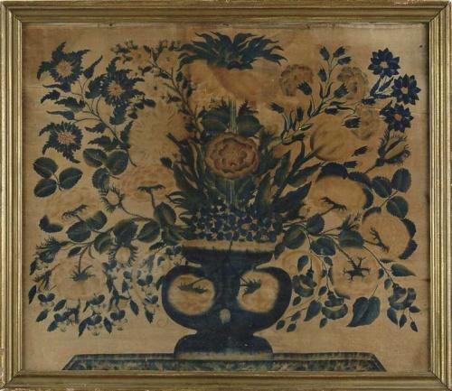 LARGE ANTIQUE THEOREM. Watercolor on fabric shows a large shaped vase on the center of a table with a large floral arrangement. Housed in an old gilt molded wood frame. SIGHT SIZE: 21” x 24-1/2”. CONDITION: Brown toned, faded. Good. 9-27120