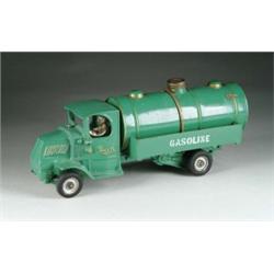 LARGE ARCADE MACK GASOLINE TRUCK.  Truck painted green overall with a tin tank being supported by a cast iron frame stenciled, “GASOLINE”.  Tank has original screw on cap and an original Arcade decal, four black hard rubber wheels with silver hubs and a nickel-plated cast iron driver.  SIZE:  12-1/2” l.  CONDITION:  Near mint.  MC 1-3915 (2,000-2,500)