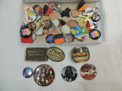 LARGE ASSORTED LOT BELT BUCKELS, BUTTONS, RIBBONS & PINS. DUKES OF HAZZARD, KISS, SPORT RIBBONS. AS SHOWN. VIEW PICTURE FOR DETAIL.