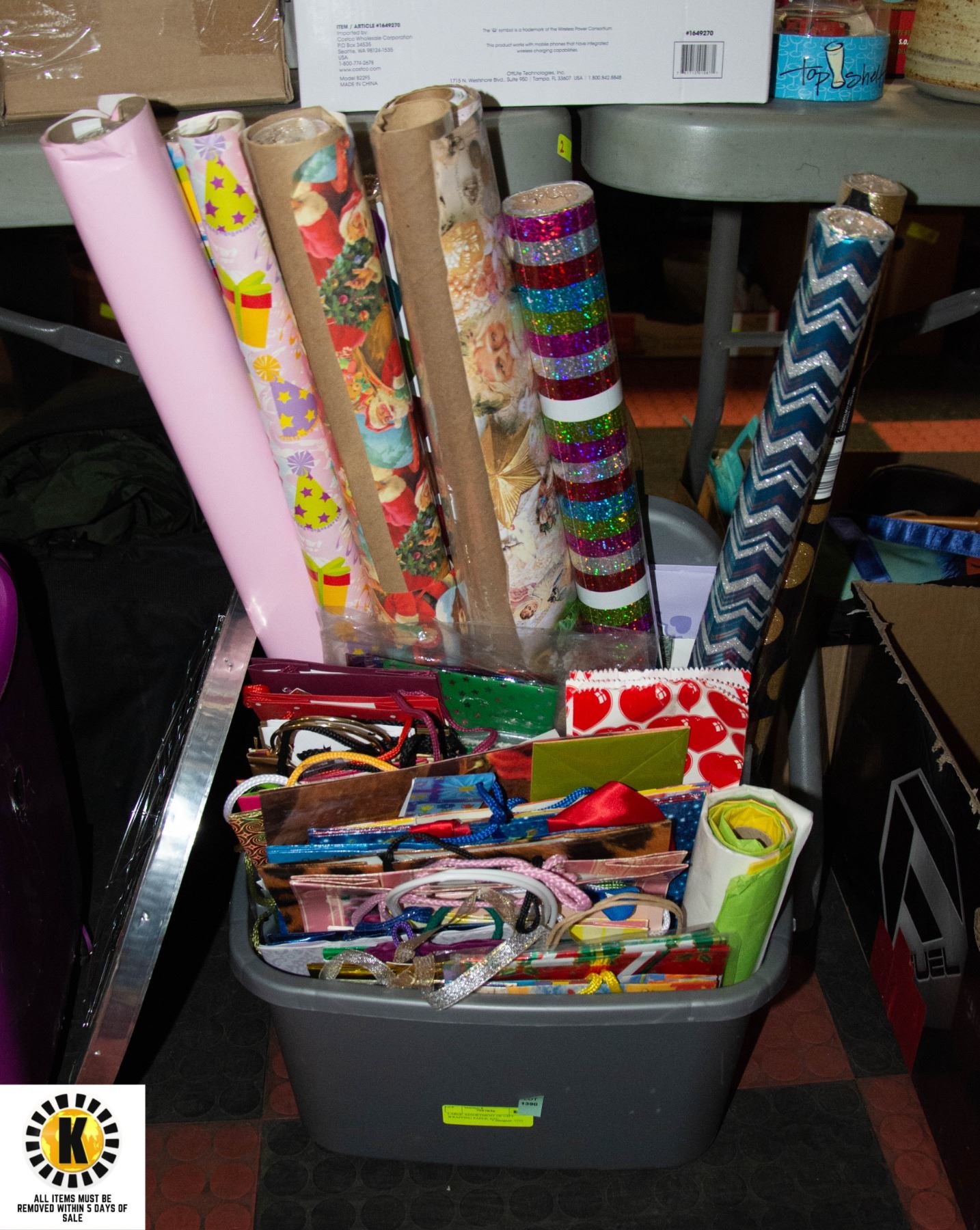10 ROLLS PAPER, OVER 35 GIFT BAGS/BOXES, METALLIZED MYLAR WRAP, AND MUCH MORE. **ALL ITEMS MUST BE REMOVED BY 5PM SATURDAY, APRIL 22ND, 2023. ALL REMAINING ITEMS WILL BE SUBJECT TO A $6.00 PER DAY STORAGE CHARGE. ANY ITEMS REMAINING AFTER MONDAY, MAY 8TH, 2023 WILL BE CONSIDERED FORFEITED. NO REFUNDS WILL BE ISSUED FOR FORFEITED ITEMS.** TO SCHEDULE A PICK UP APPOINTMENT CLICK HERE
