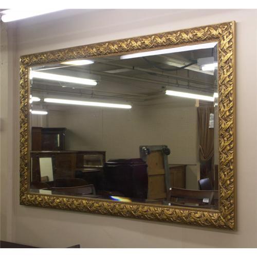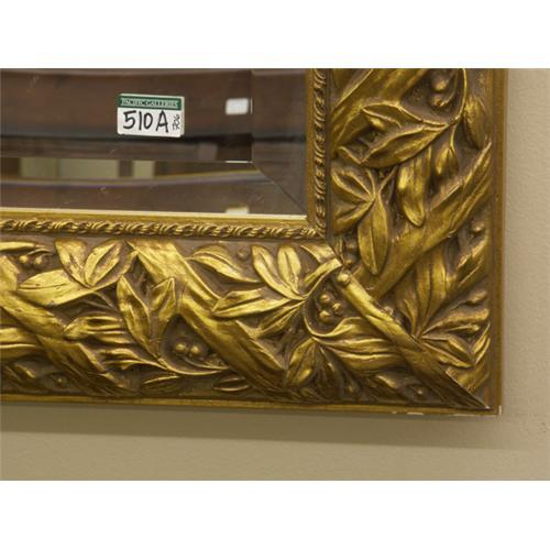 LARGE MIRROR: 43'' x 67'' beveled mirror in a carved flora detail gilt frame.