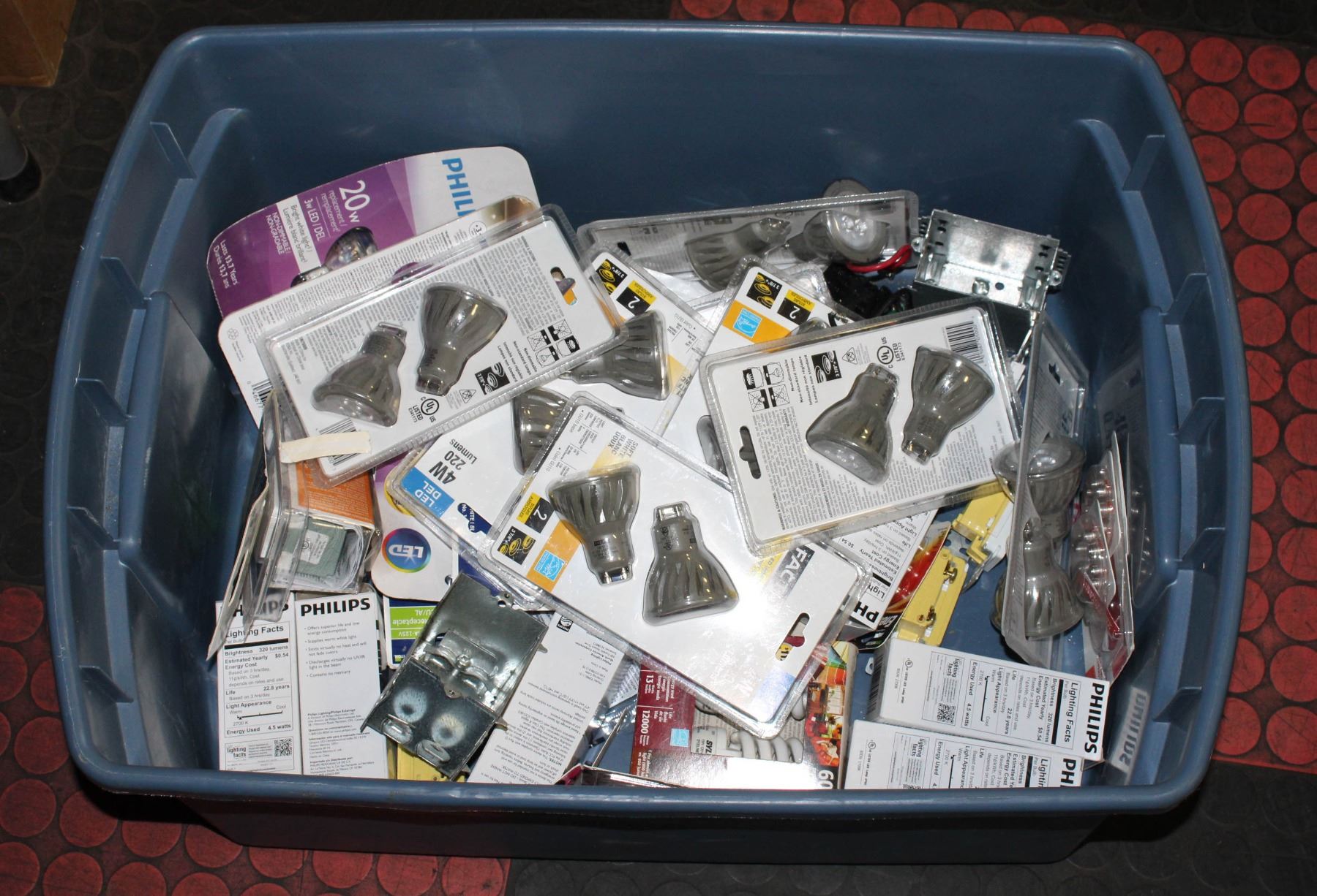LARGE BIN OF ELECTRICAL SWITCHES, BOXES, BULBS