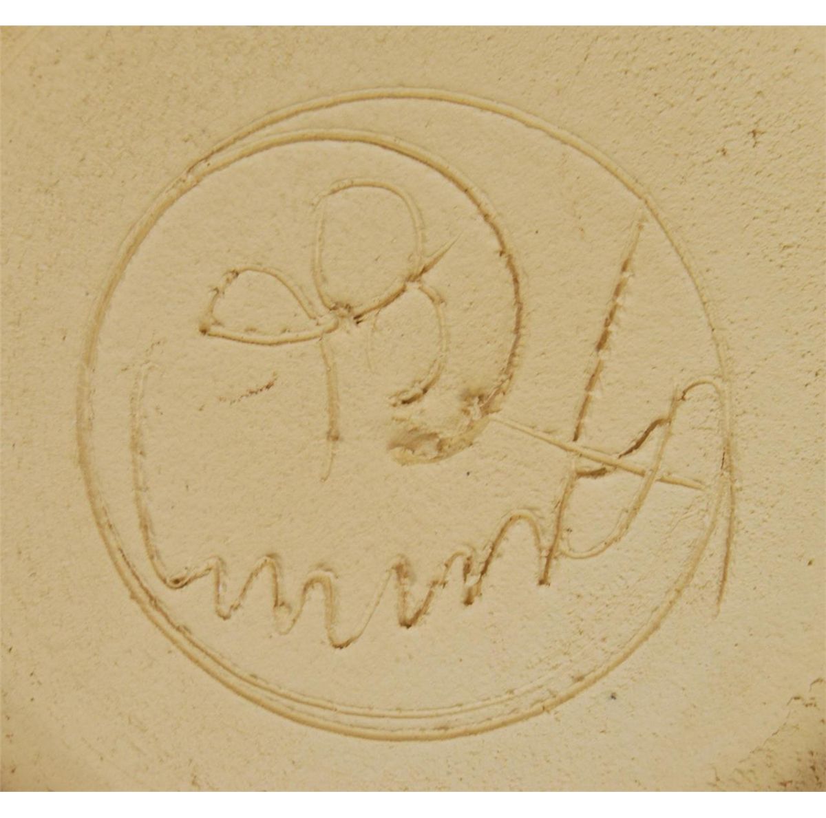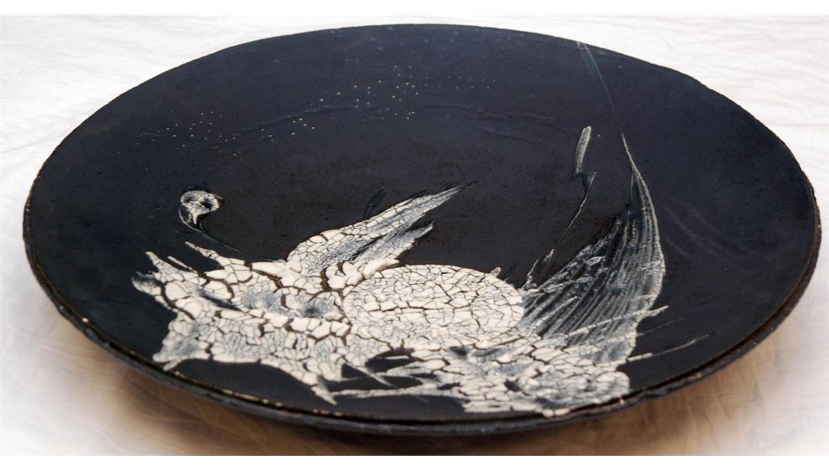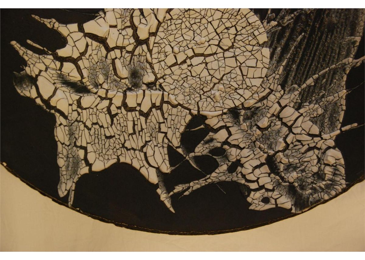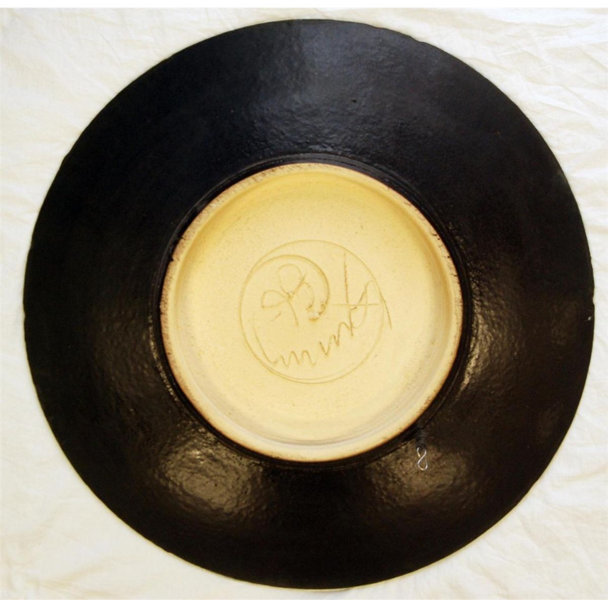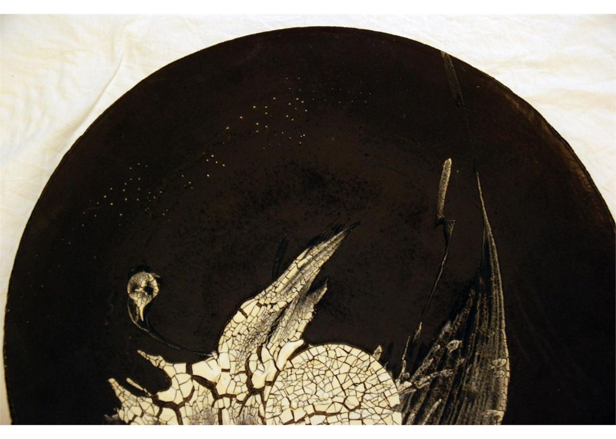 A large black and white enameled ceramic charger. Signed and dated '86 to bottom. Measures 28" diameter (71.1cm).
