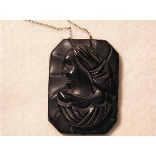 Very unusual black rectangular cameo pendent. It looks like bakelite. I put semichrome on it and it did NOT turn yellow, so I believe this means it isn't bakelite. It is an early 20th century plastic of some kind. The carving is good. There is nothing wrong with her nose. It's just the way the artist carved her. It has a 20" sterling silver chain on it. It comes from a plantation estate in the Mississippi Delta called Linden. It is located in Glen Allen, MS on Lake Washington.