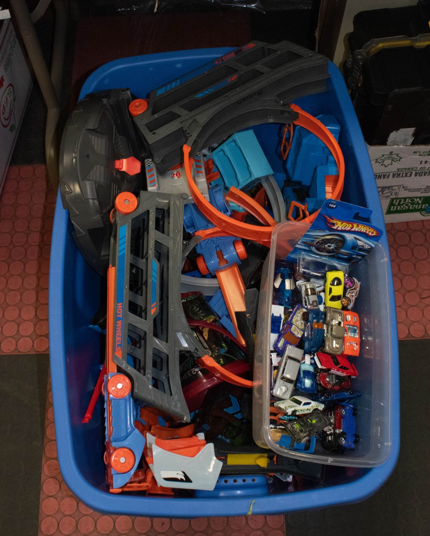 LARGE BLUE BIN WITH HOT WHEELS, TRACK & CARS