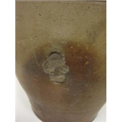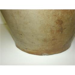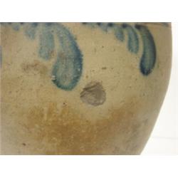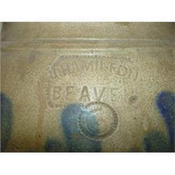 LARGE PENNSYLVANIA BLUE DECORATED STONEWARE CROCK WITH EARS. 6 gallon. Blue floral decoration on front of body and ears. Marked on front "J. Hamilton-Beaver". Has staining from firing. 16" H