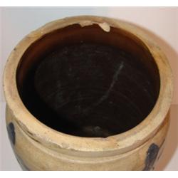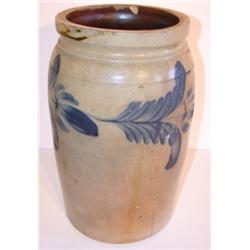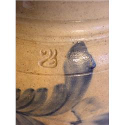 Large blue decorated stoneware crock. Stamped number 2 on body. Several small surface chips along inside rim of top. Good overall condition. 13.5" H