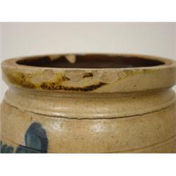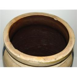 LARGE BLUE DECORATED STONEWARE CROCK. Blue floral decoration on body. Stamped number 2 on body. Several small surface chips along inside rim of top. Good overall condition. 13.5" H