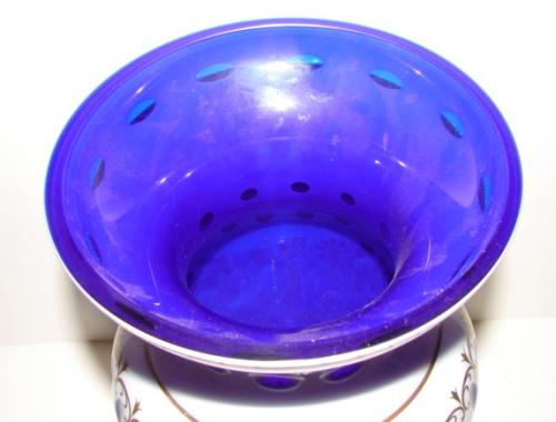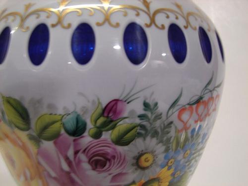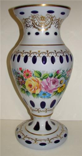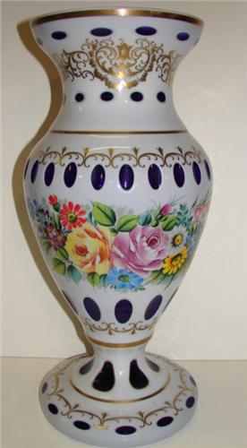 LARGE BOHEMIAN GLASS VASE. White cut to cobalt blue glass. Hand painted floral decoration with ornate gilt work. Excellent condition. 17” H