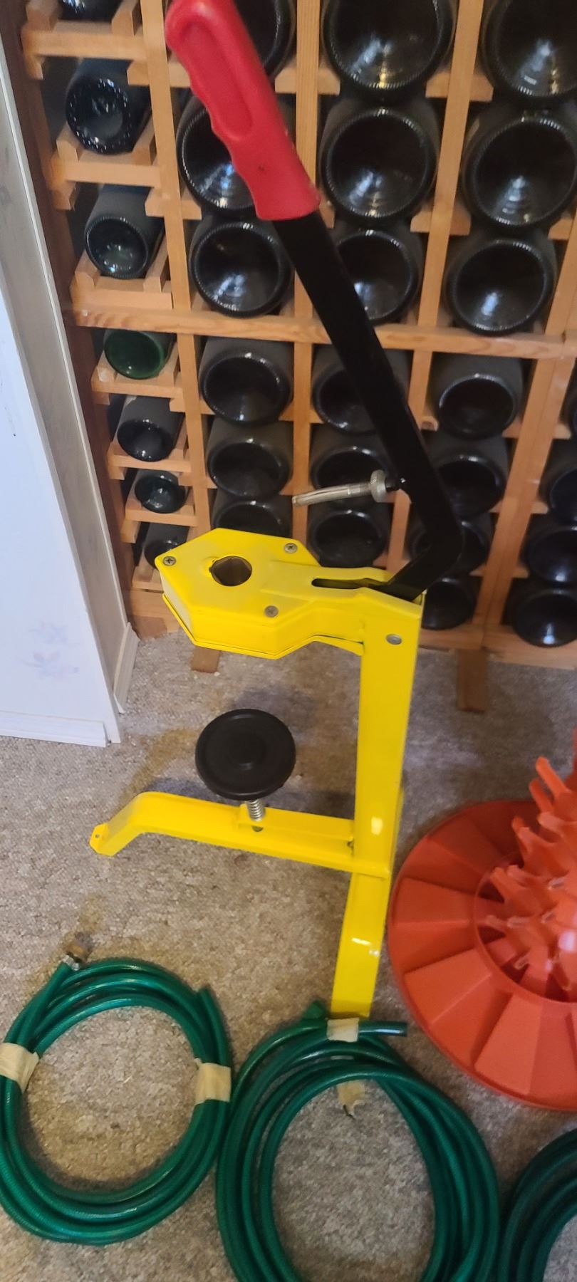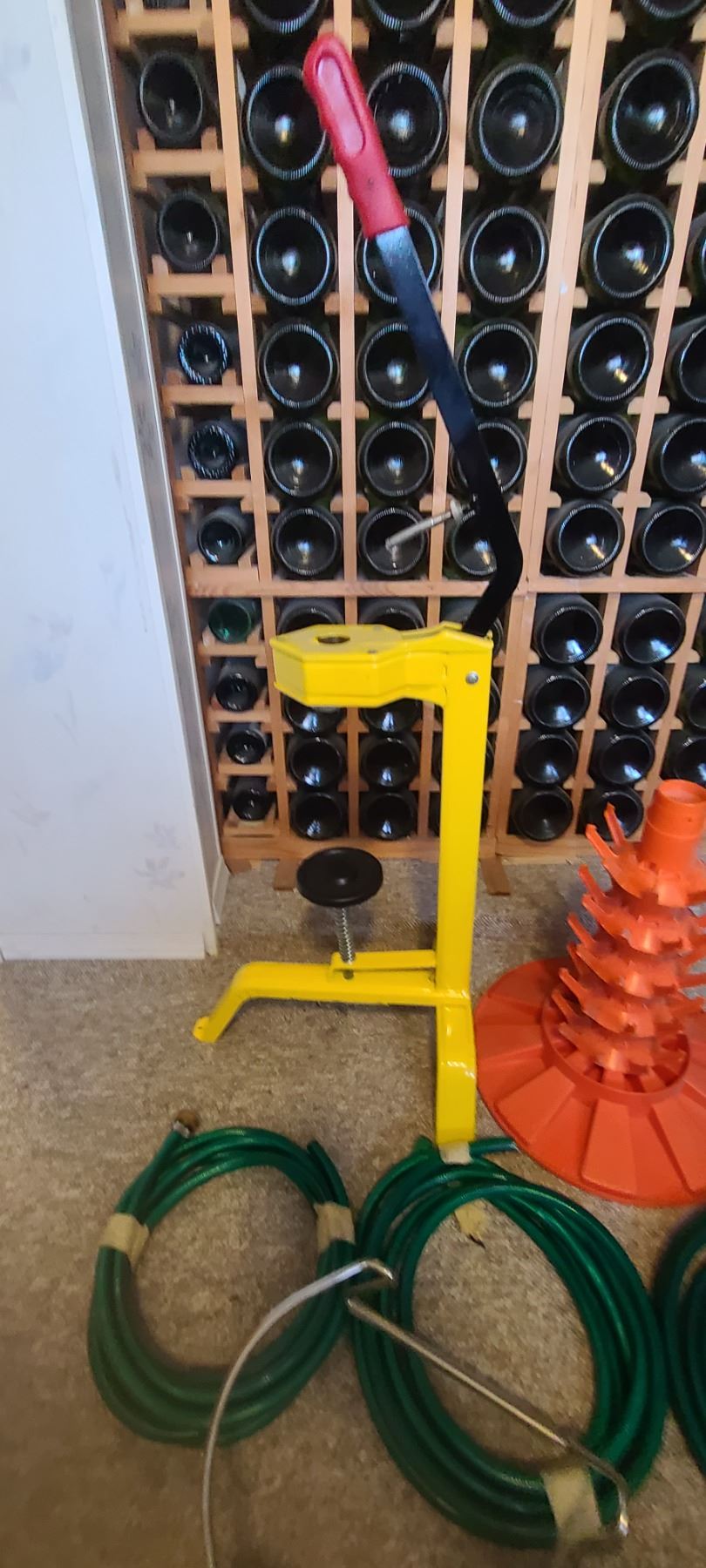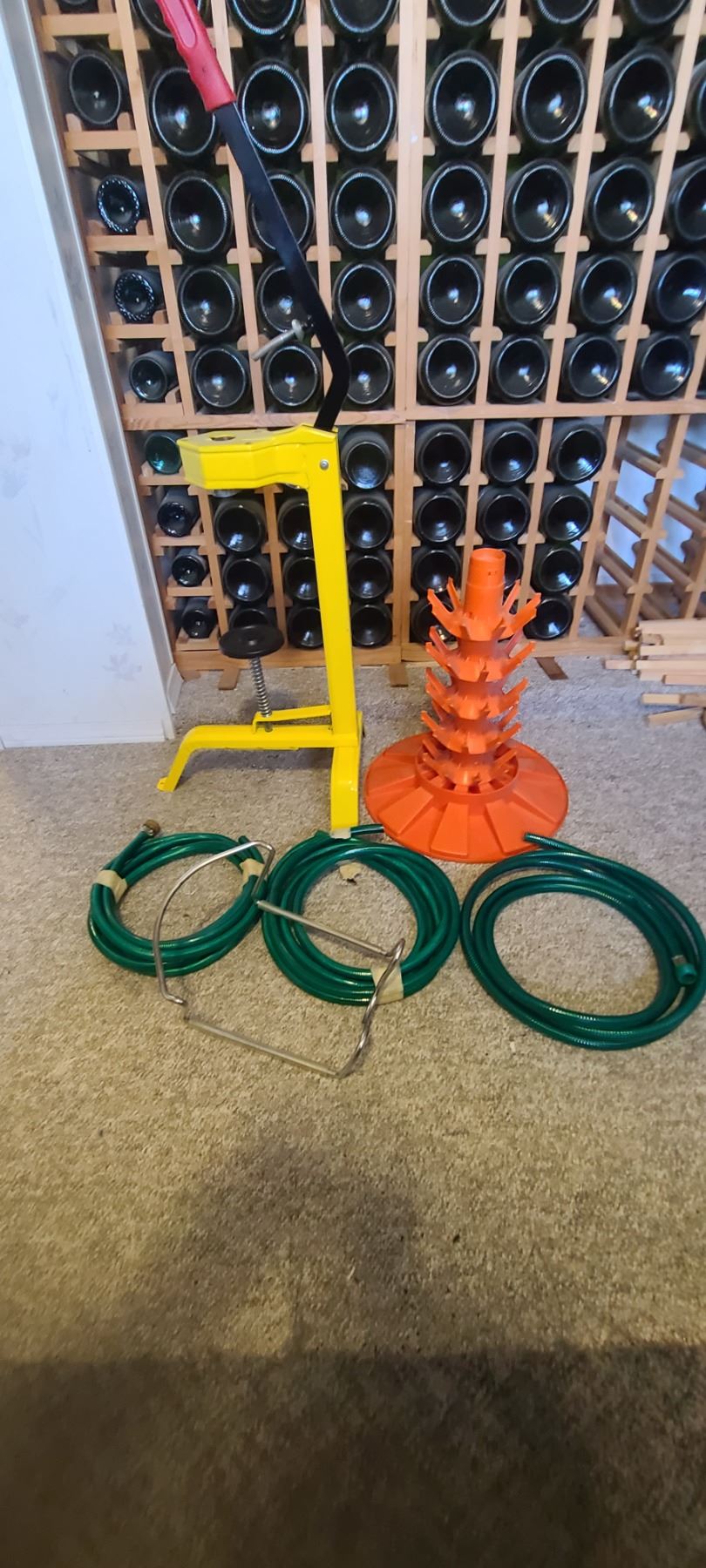 LARGE BOTTLE CAPPER PRESS, BOTTLE DRYING STAND AND THREE HOSES