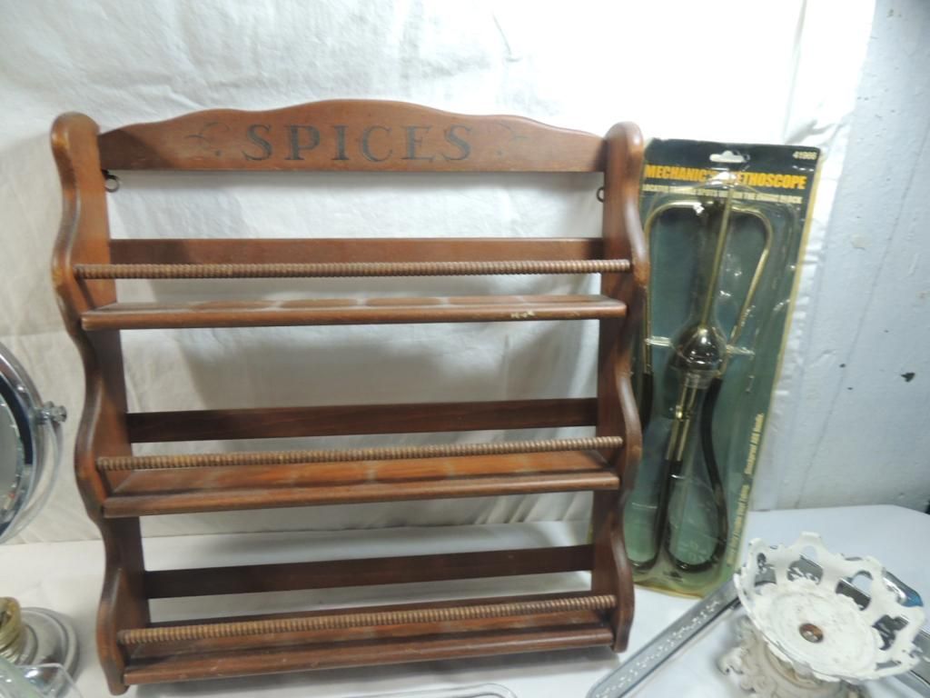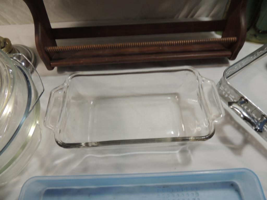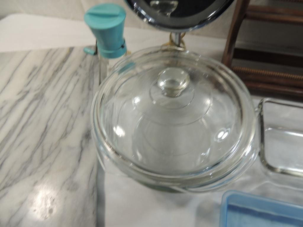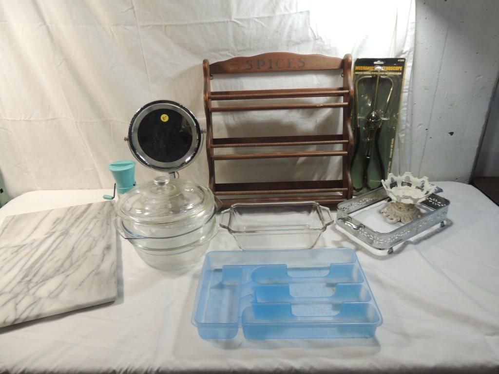 CASSEROLE DISHES, GLASS DISHES, WOODEN SPICE RACK, MARBLE CUTTING BOARD, MAGNIFYING MIRROR, ASSORTED VINTAGE AS SHWON SEE PHOTO FOR MORE DETAILS.