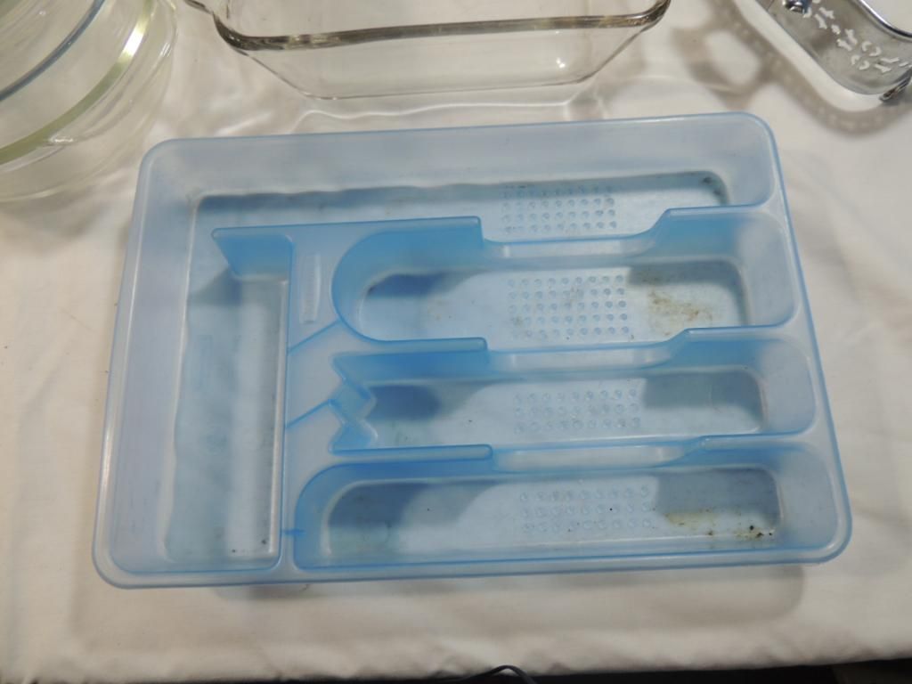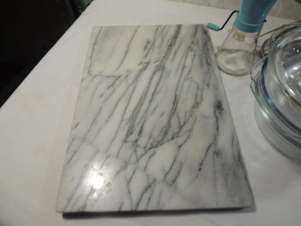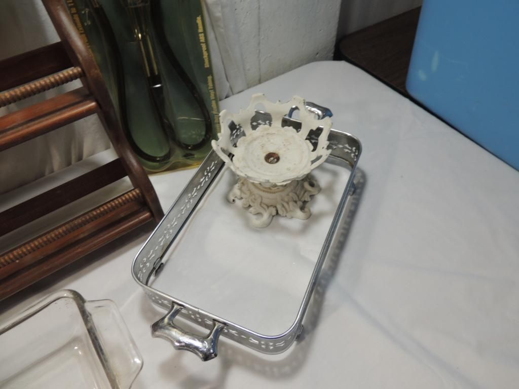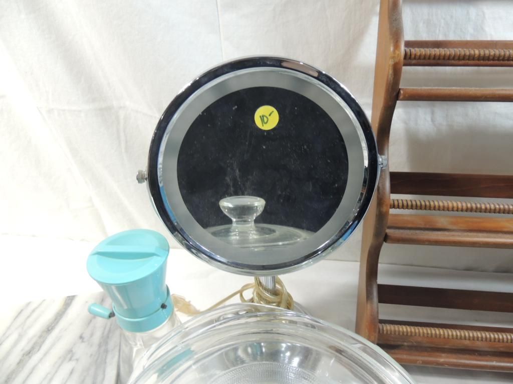 CASSEROLE DISHES, GLASS DISHES, WOODEN SPICE RACK, MARBLE CUTTING BOARD, MAGNIFYING MIRROR, ASSORTED VINTAGE AS SHWON SEE PHOTO FOR MORE DETAILS.
