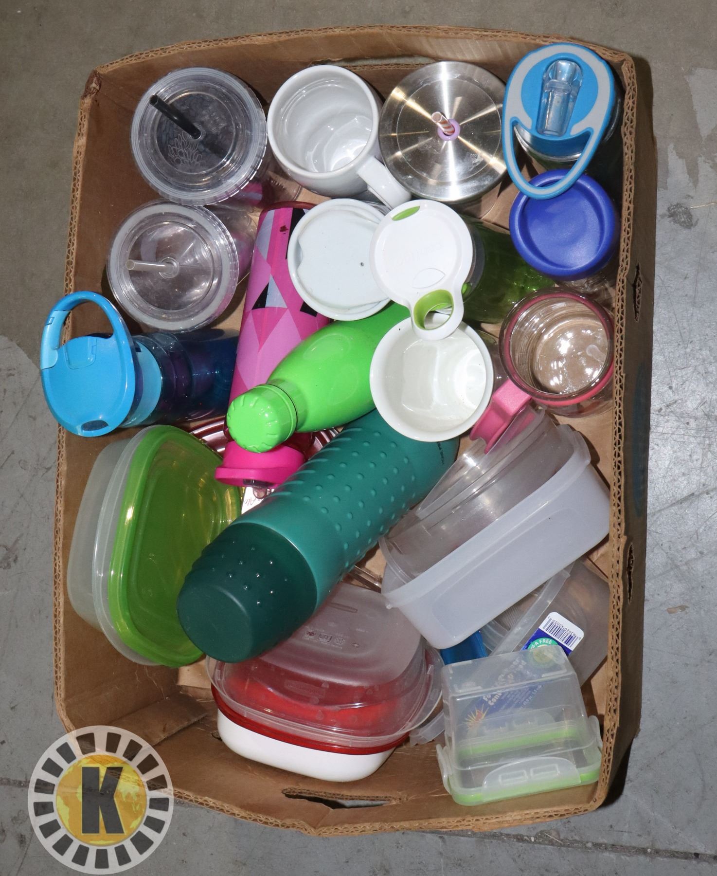 LARGE BOX OF ASSORTED DRINK CONTAINERS,