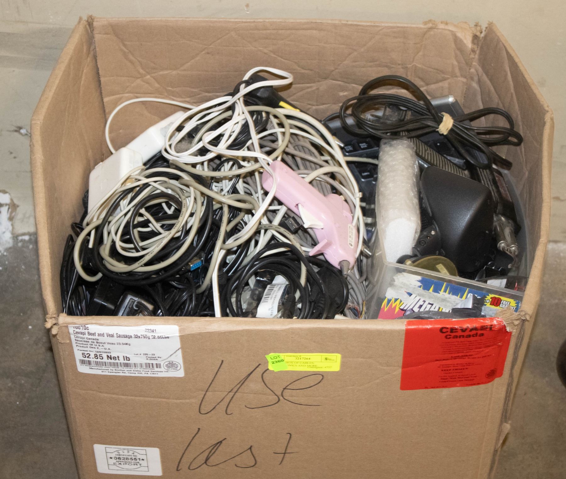LARGE BOX OF CABLES, ELECTRONICS AND MORE