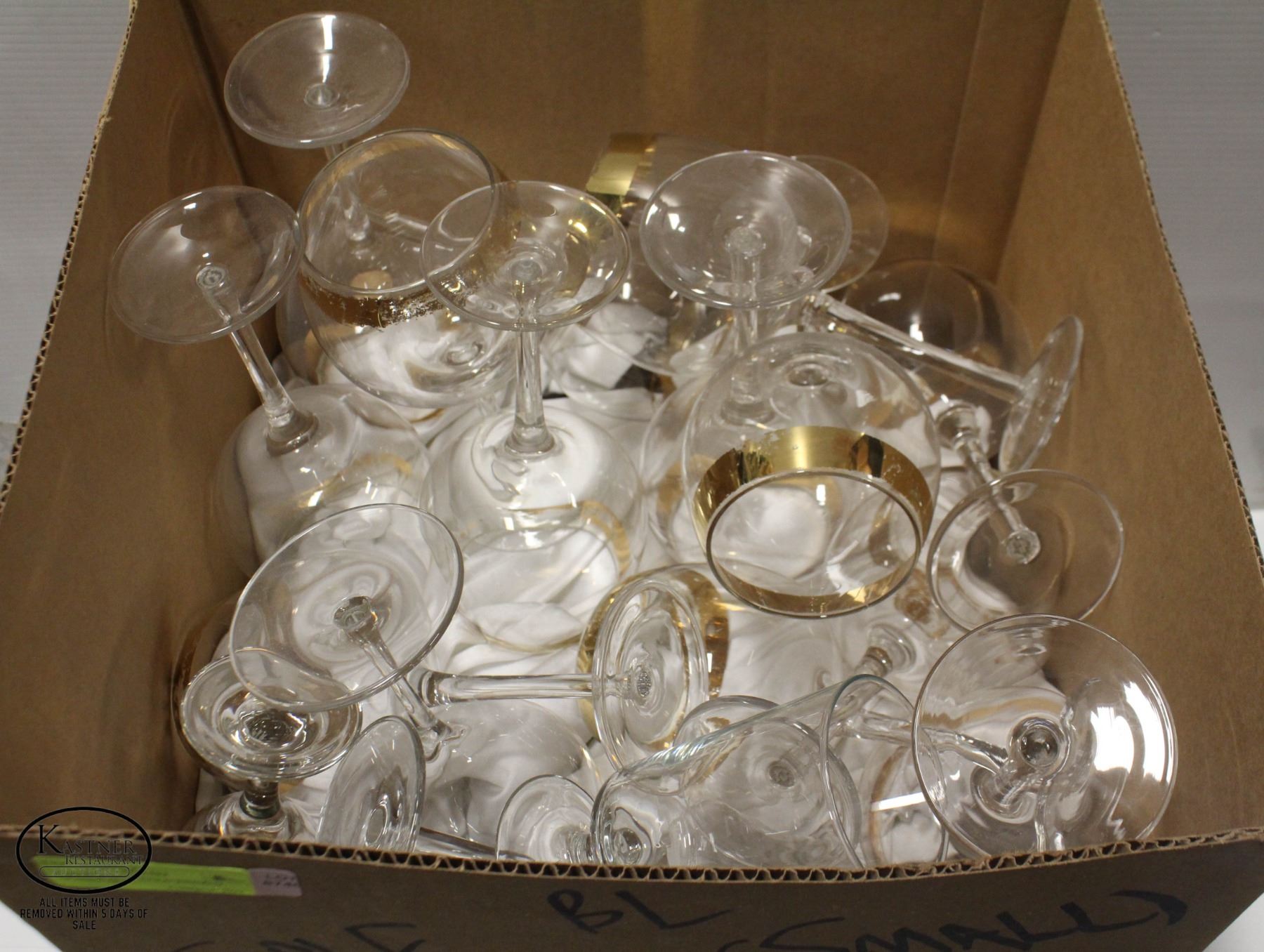 LARGE BOX OF GOLD-RIMMED GLASSWARE