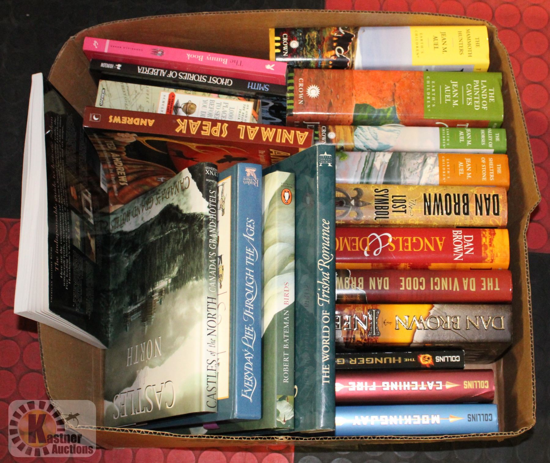 TABLETOP BOOKS INCL. JEAN M. AUEL 1ST EDITION HARD COVERS AND DAN BROWN 1ST EDITION HARD COVERS WITH DUST JACKETS, HUNGER GAMES SERIES, ROBERT BATEMAN BIRDS BOOK, CASTLES OF THE NORTH (CANADA), TRISHA ROMANCE, ETC. (20 BOOKS TOTAL)