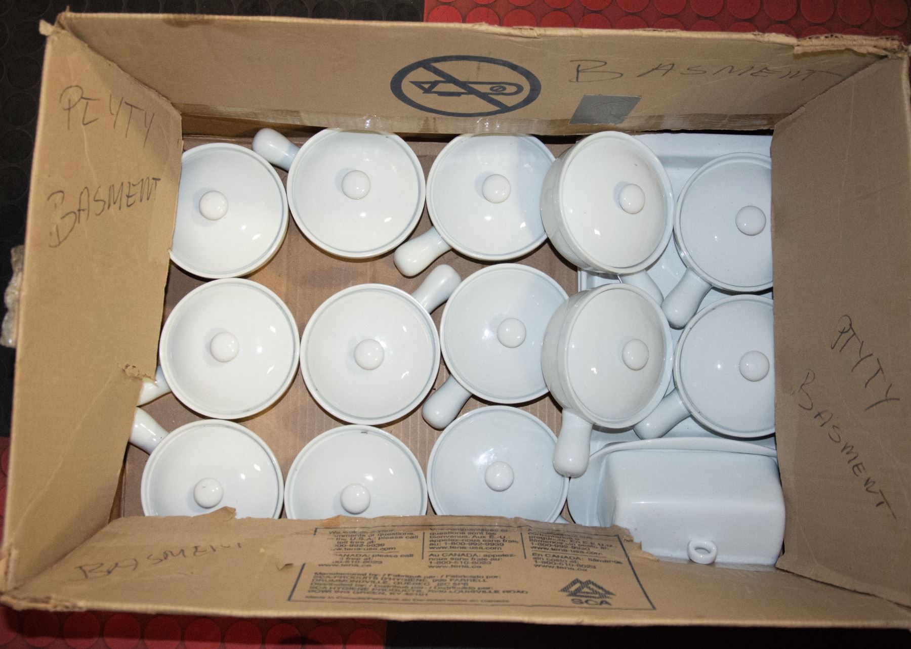 LARGE BOX OF LIDDED SOUP BOWLS, PLATTERS & BUTTER