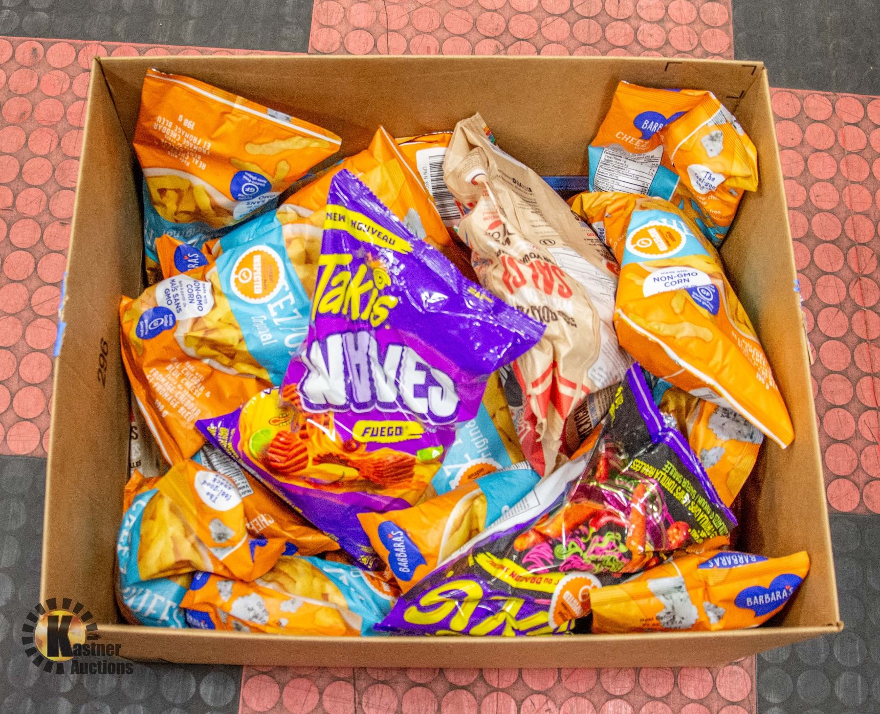 LARGE BOX OF MIXED SNACKS CHEEZ PUFFS, YAKIS WAVES