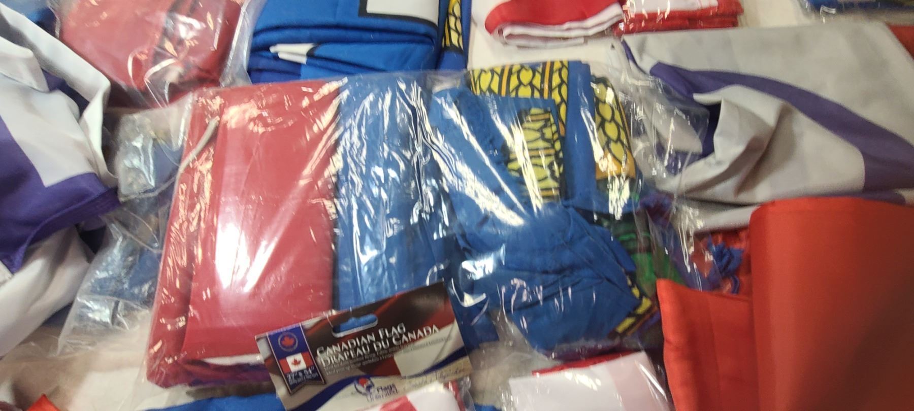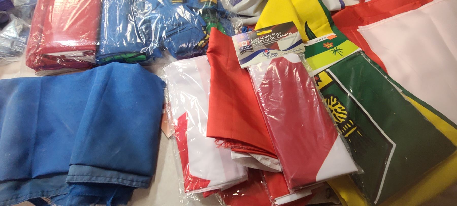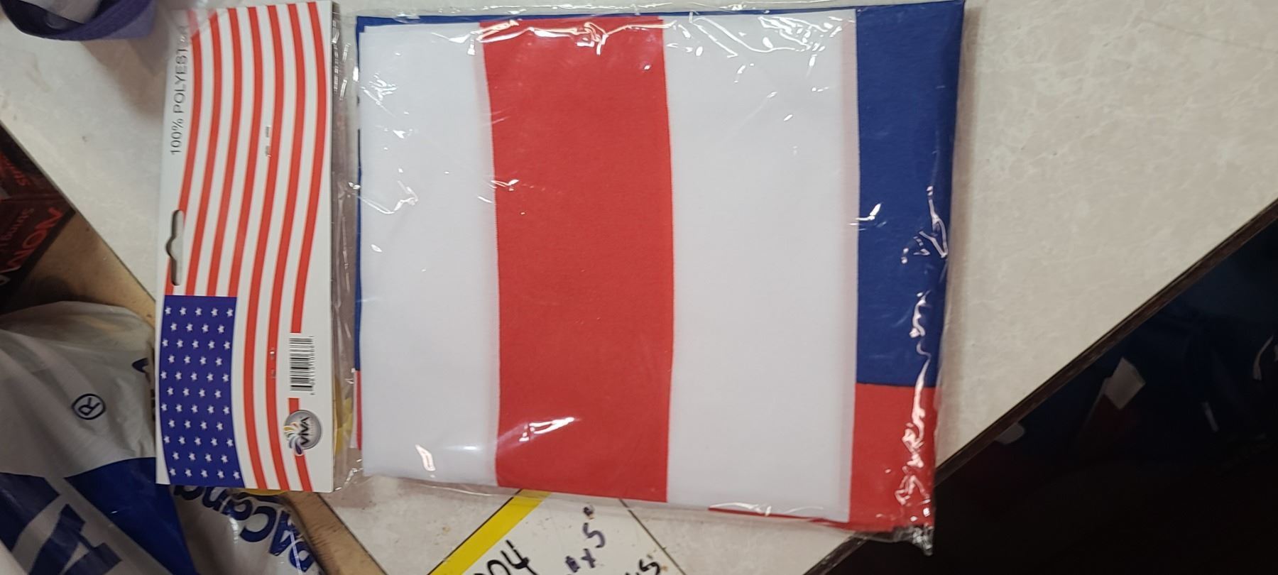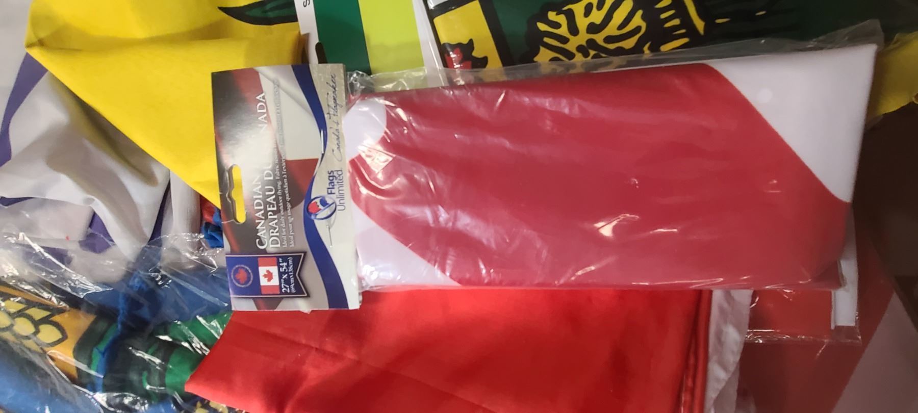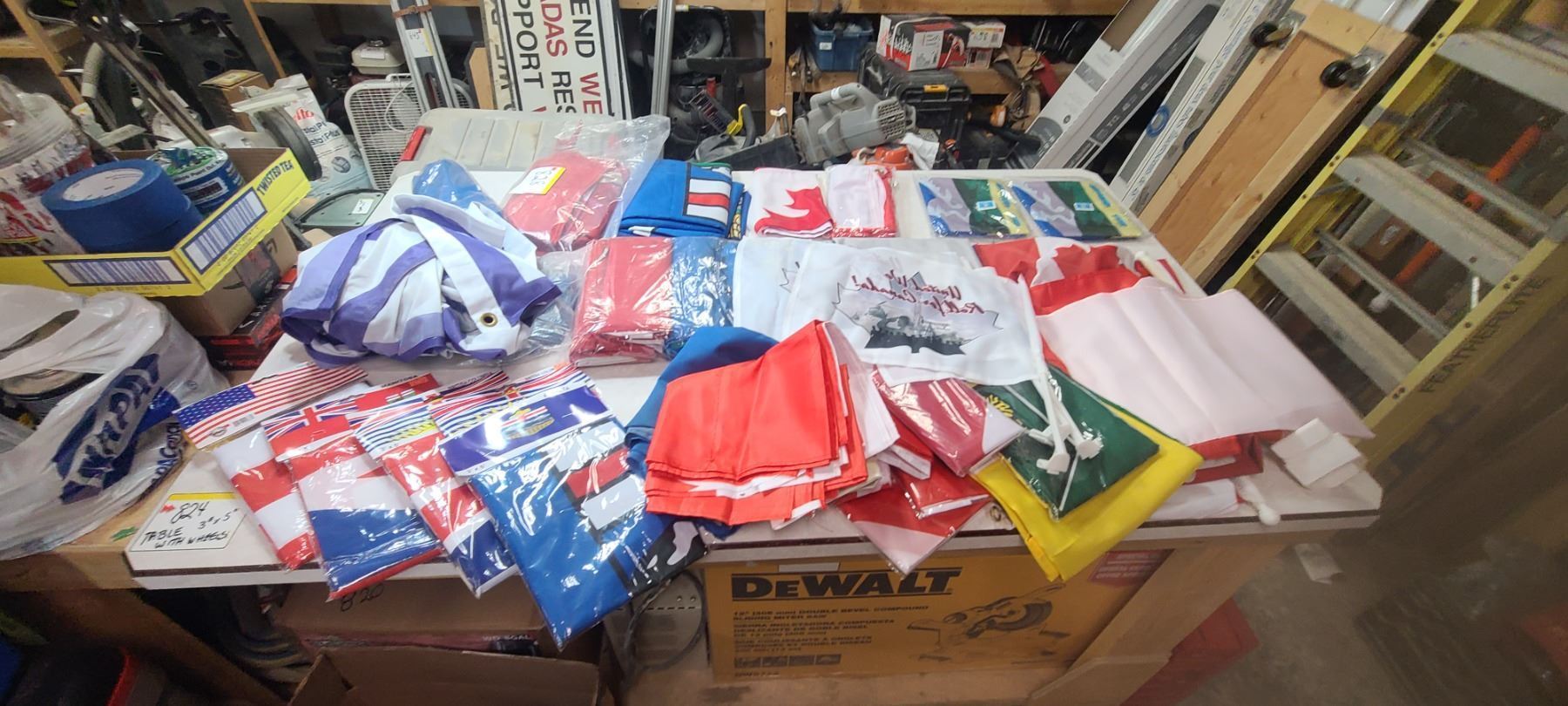 LARGE BOX OF NEW AND USED FLAGS ROUGHLY 25 NEW AND 25 USED