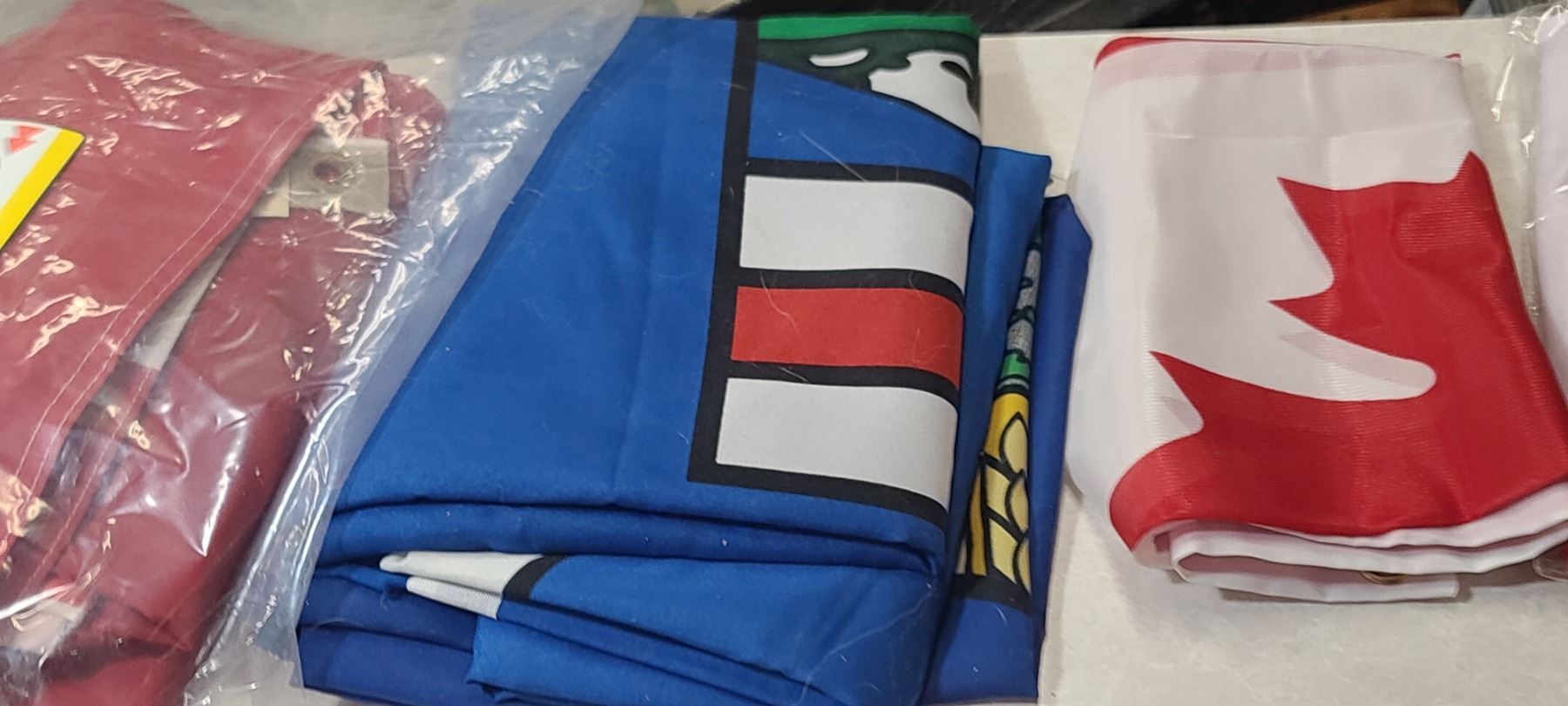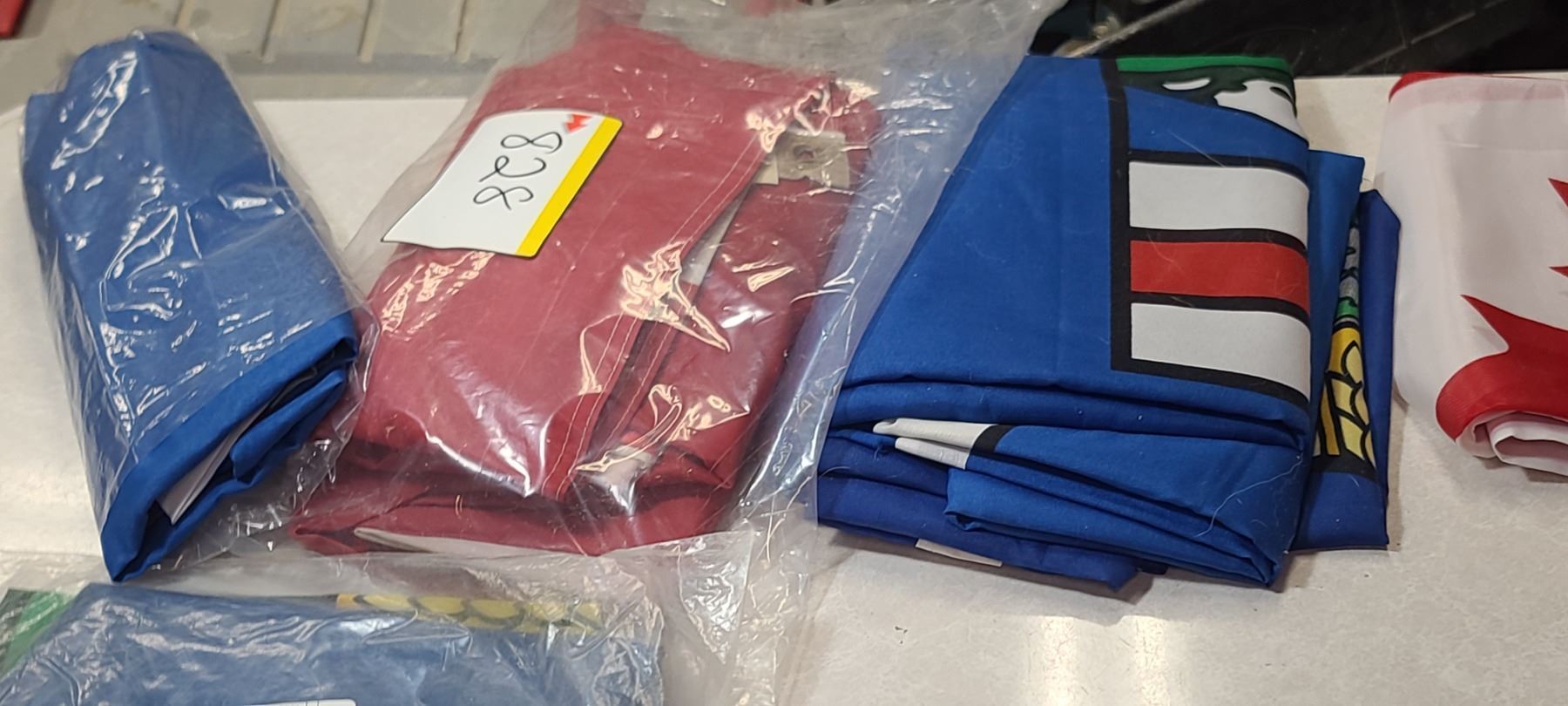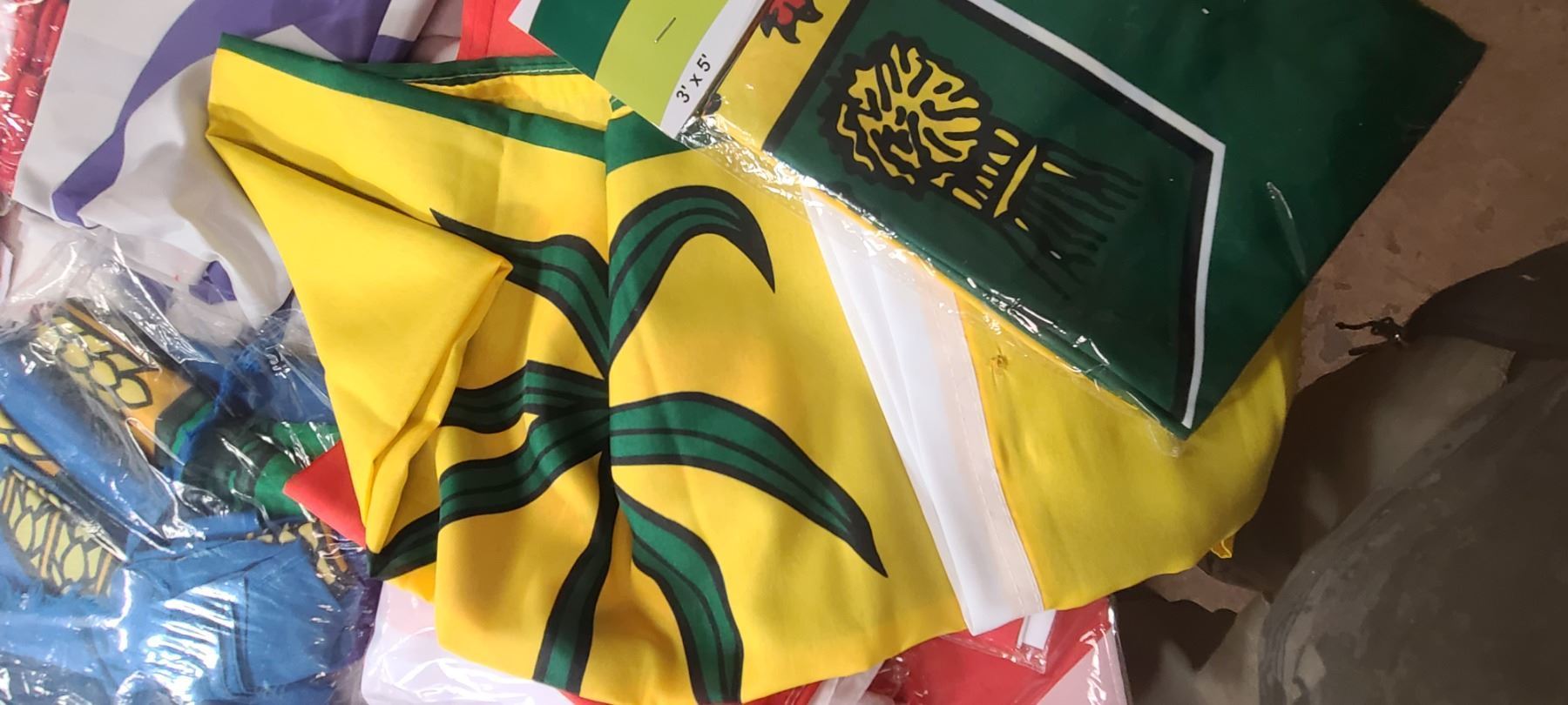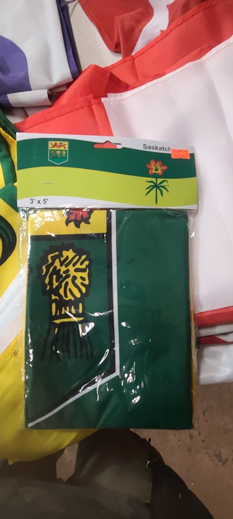 LARGE BOX OF NEW AND USED FLAGS ROUGHLY 25 NEW AND 25 USED