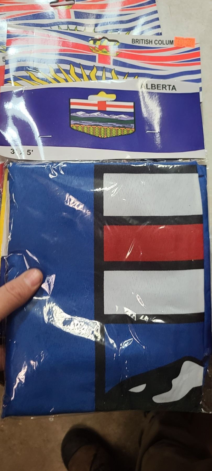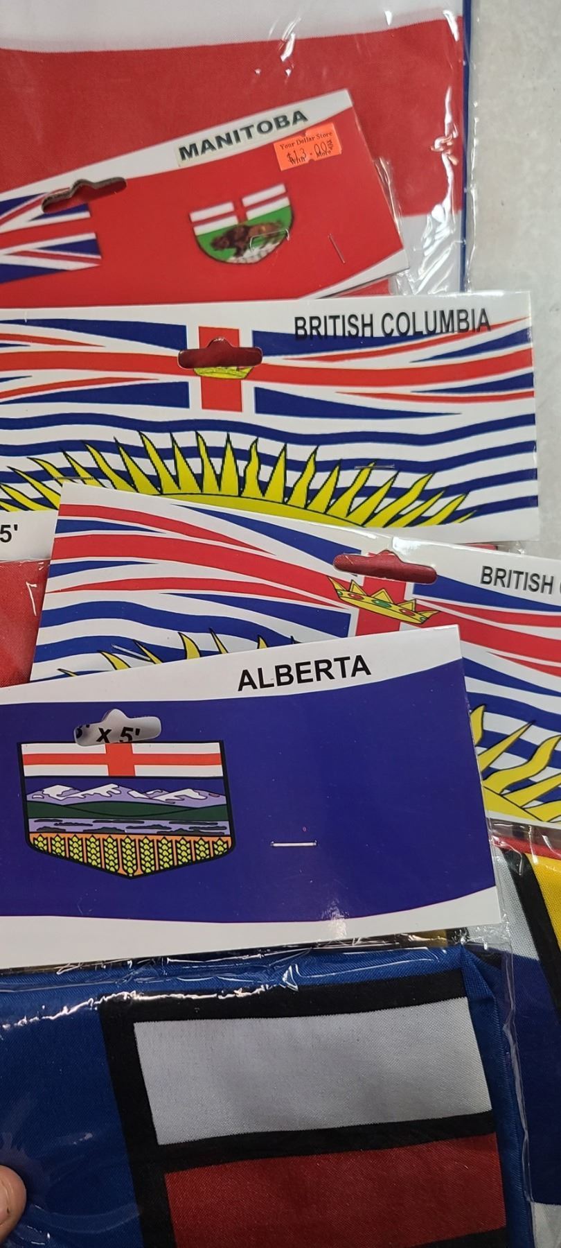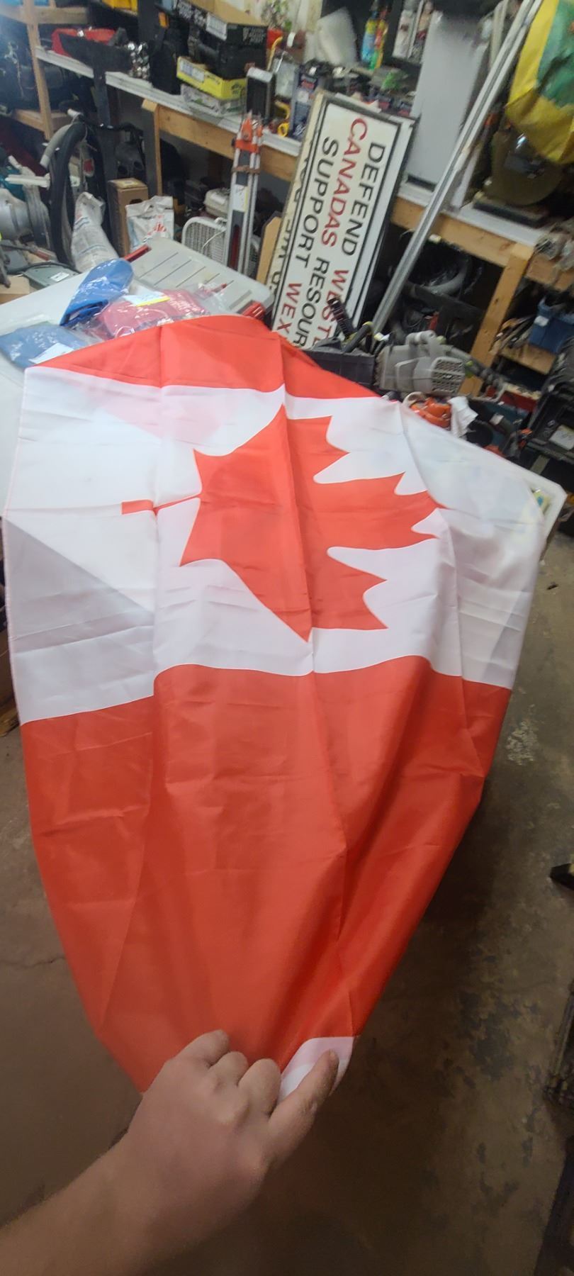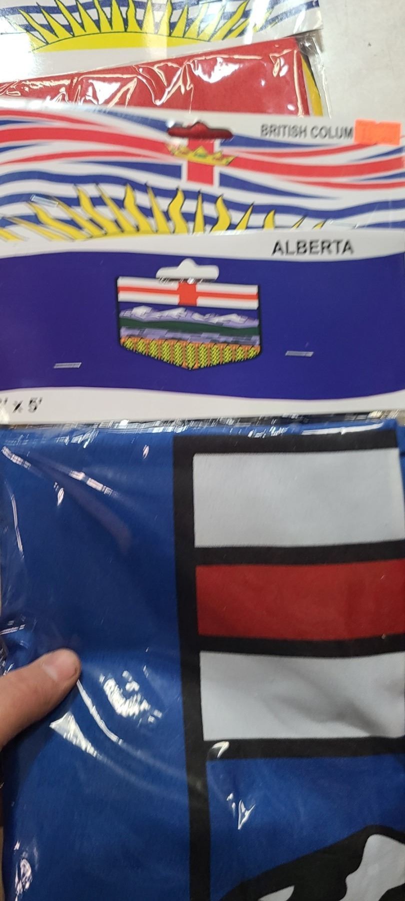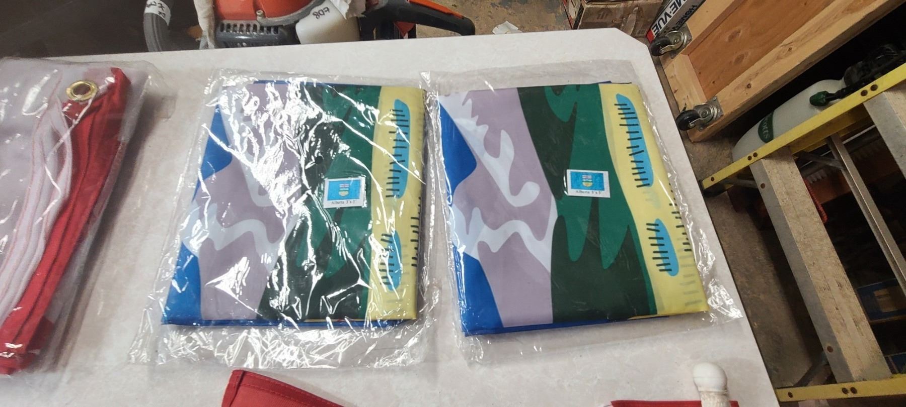 LARGE BOX OF NEW AND USED FLAGS ROUGHLY 25 NEW AND 25 USED