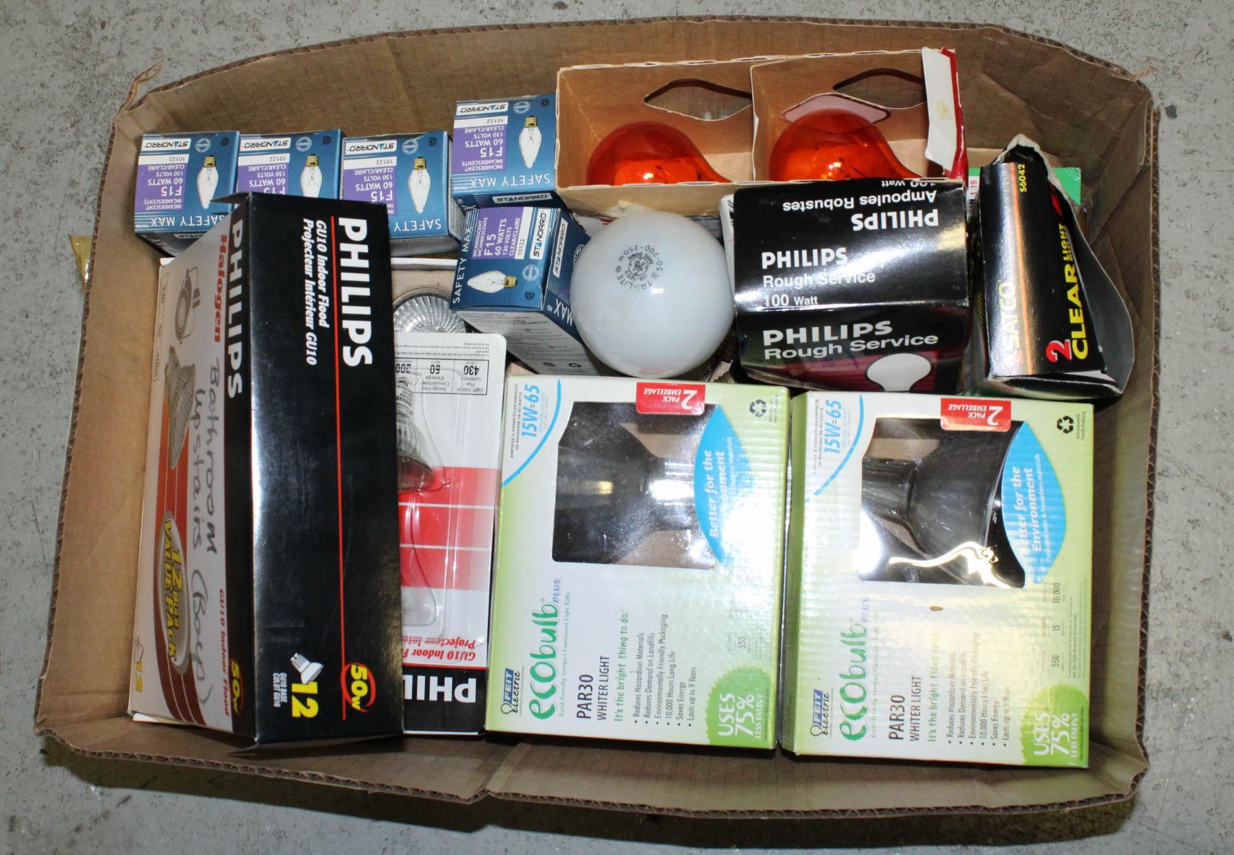 PHILIPS 50 WATT HALOGEN GA10 INDOOR FLOOD, 5 SAFETY MAX F5 60 WATTS, 3X PAR 30 ECOBULB PLUS, PHILIPS 100 WATT ROUGH SERVICE BULBS, ETC.
