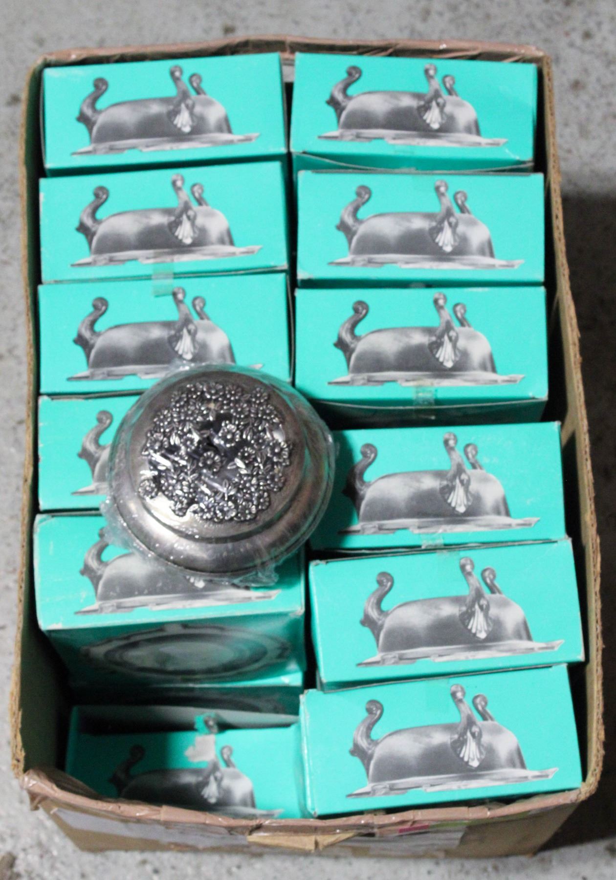 LARGE BOX OF PEWTER CONTAINERS FOR KEEPSAKES