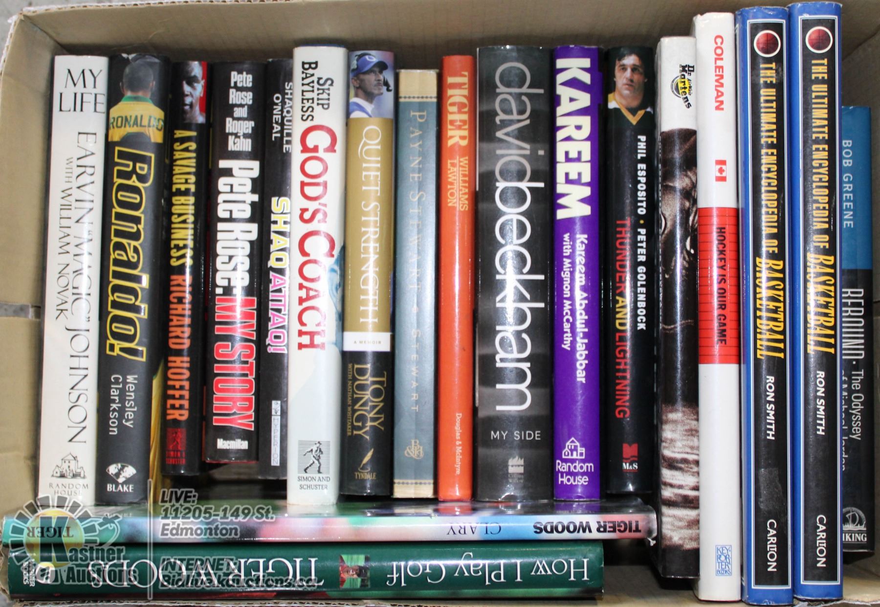 LARGE BOX OF SPORTS RELATED HARD COVERS.
