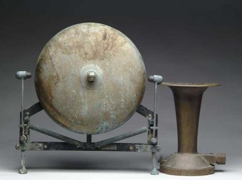 LARGE BRASS FOG HORN AND SHIPS BELL. Large trumpet shaped horn is 14” h x 10-1/4” w. The flat gong type bell with spring outside clapper. 17” dia. bell. Brass plaque “Henschel Corp Amesbury, Mass”. CONDITION: Generally good. 9-27110