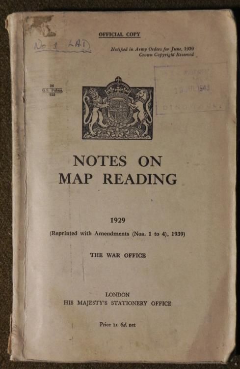 HERE IS A LARGE BRITISH MILITARY 1929 MANUAL ON MAP READING FROM THE WAR OFFICE, LONDON.  IT WAS PRINTED BY HIS MAJESTY'S STATIONERY OFFICE AND CONTAINS MANY FOLD-OUTS.  IT CONTAINS 95 PAGES AND HAS1943 MILITARY STAMPING ON THE COVER. *