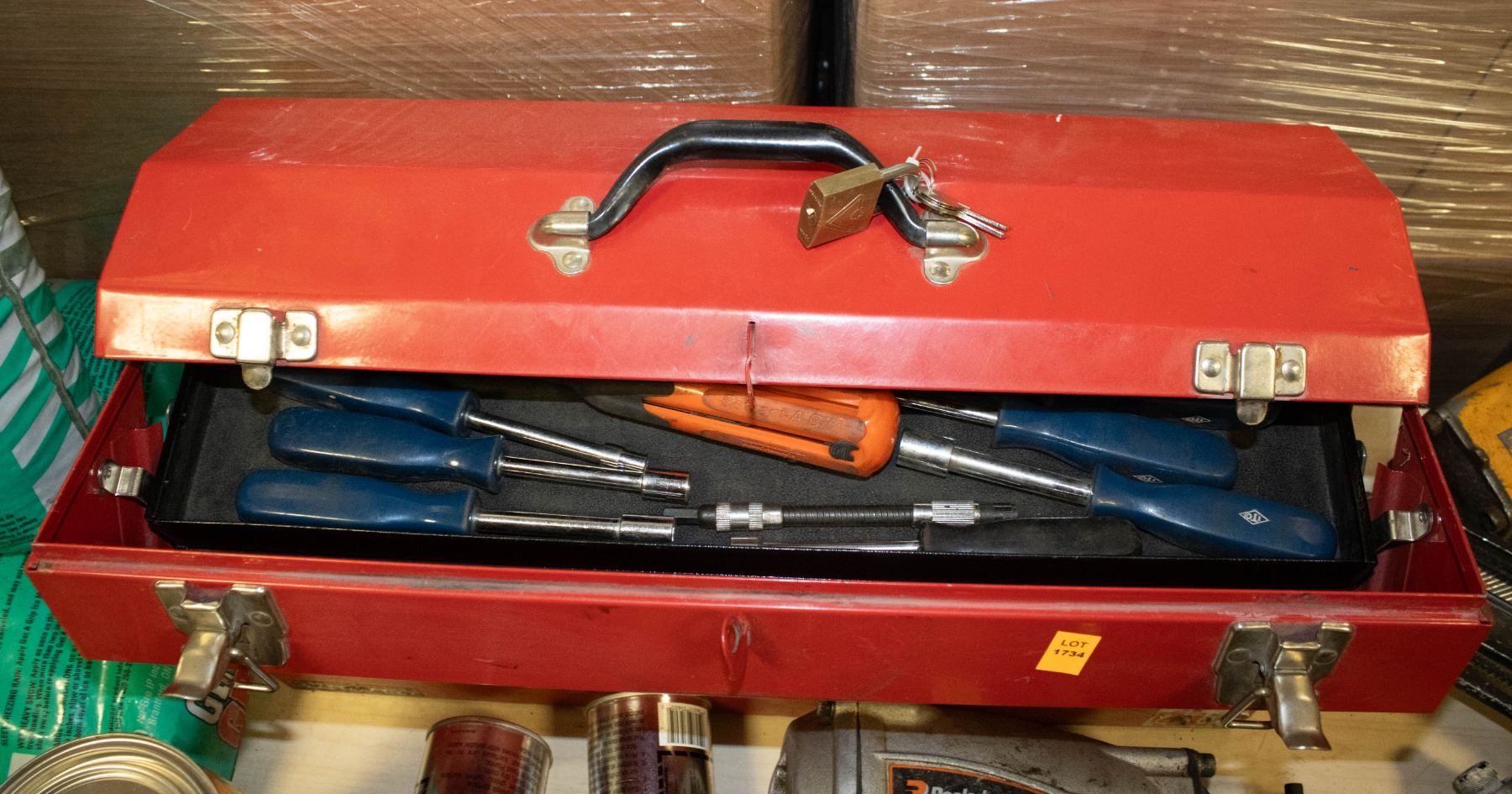 FULL OF HAND TOOLS WITH LOCK AND 2 KEYS **ALL ITEMS MUST BE REMOVED BY 5PM SATURDAY, SEPTEMBER 2ND 2023. ALL REMAINING ITEMS WILL BE SUBJECT TO A $6.00 PER DAY STORAGE CHARGE. ANY ITEMS REMAINING AFTER MONDAY, SEPTEMBER 18TH, 2023 WILL BE CONSIDERED FORFEITED. NO REFUNDS WILL BE ISSUED FOR FORFEITED ITEMS. TO SCHEDULE A PICK UP APPOINTMENT CLICK HERE