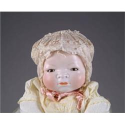 LARGE BYE-LO BABY. This large Bye-Lo baby (15” head circumference) has beautiful pale bisque and brown sleep eyes. Baby is on an unmarked but proper cloth body with celluloid hands. Clothing is newer replacement but retains original lace bonnet. CONDITION: Both celluloid hands have extensive damage. JL 1-2526