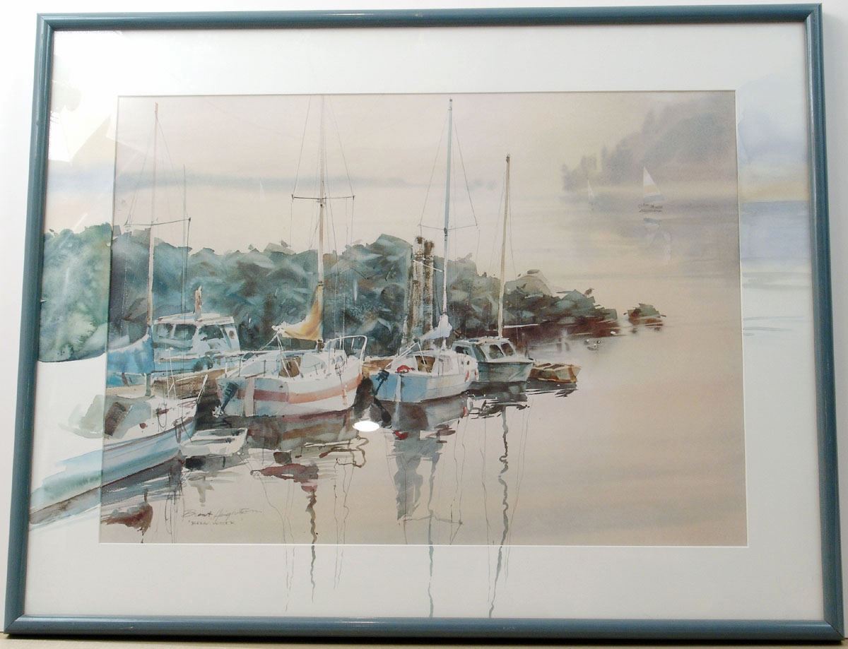 This is a Brent Heighton framed print titled Break Water. Framed behind glass with a very unique mat - it is a continuation of the print and it looks like it was hand-colored. Sailboats moored in a calm harbor. Heighton paints many scenes of areas in and around British Columbia; we believe this print depicts somewhere on Vancouver Island. SIZE: Approx. 34 1/2" x 27", 3/4"-wide frame, 3"-wide mat.