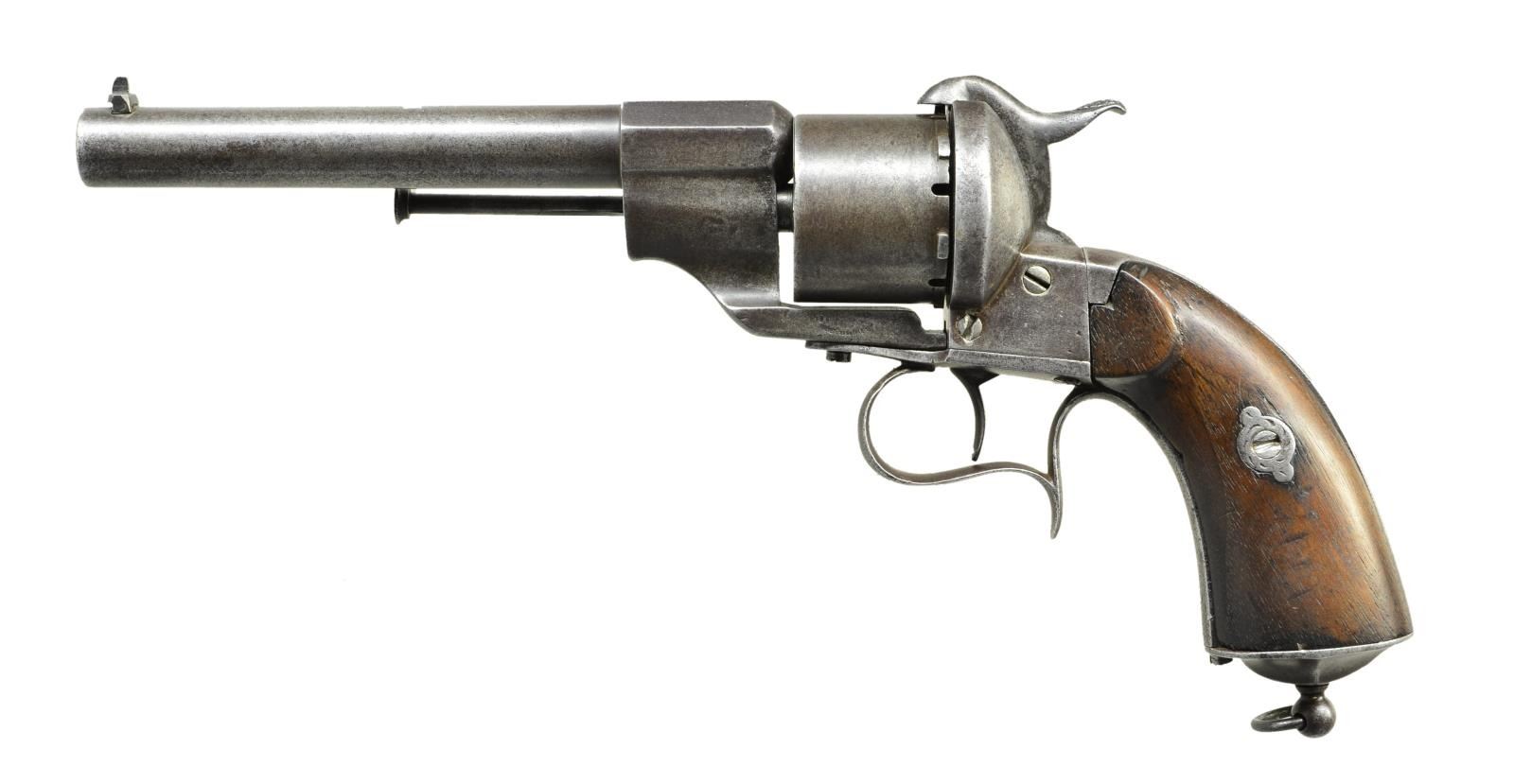 "LF". Cal. 11.5mm PF. S# 37070. Bbl. 6". single action frame w/ patent marking on left has crowned "LF" stamp on right which is in front of S# "37070". Trigger guard has spur. Grip w/ 2 piece walnut stocks has lanyard ring on cap. No other proofs or markings are found. CONDITION: fair to good. Metal cleaned to gray brown patina. Stocks shows considerable loss. Bore is good w/ a few pits. Pistol will not hold at full cock unless trigger is held forward. (01-21089/MGM). ANTIQUE. $300-450.