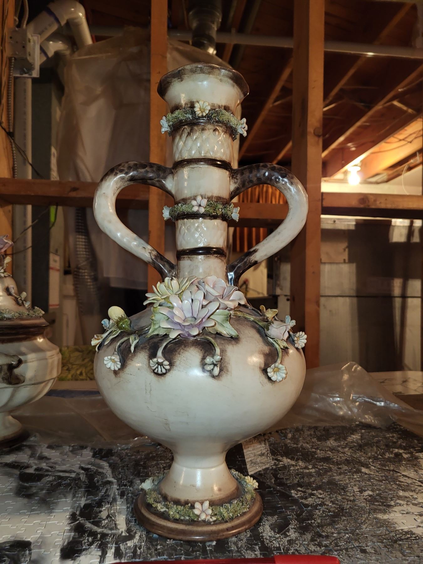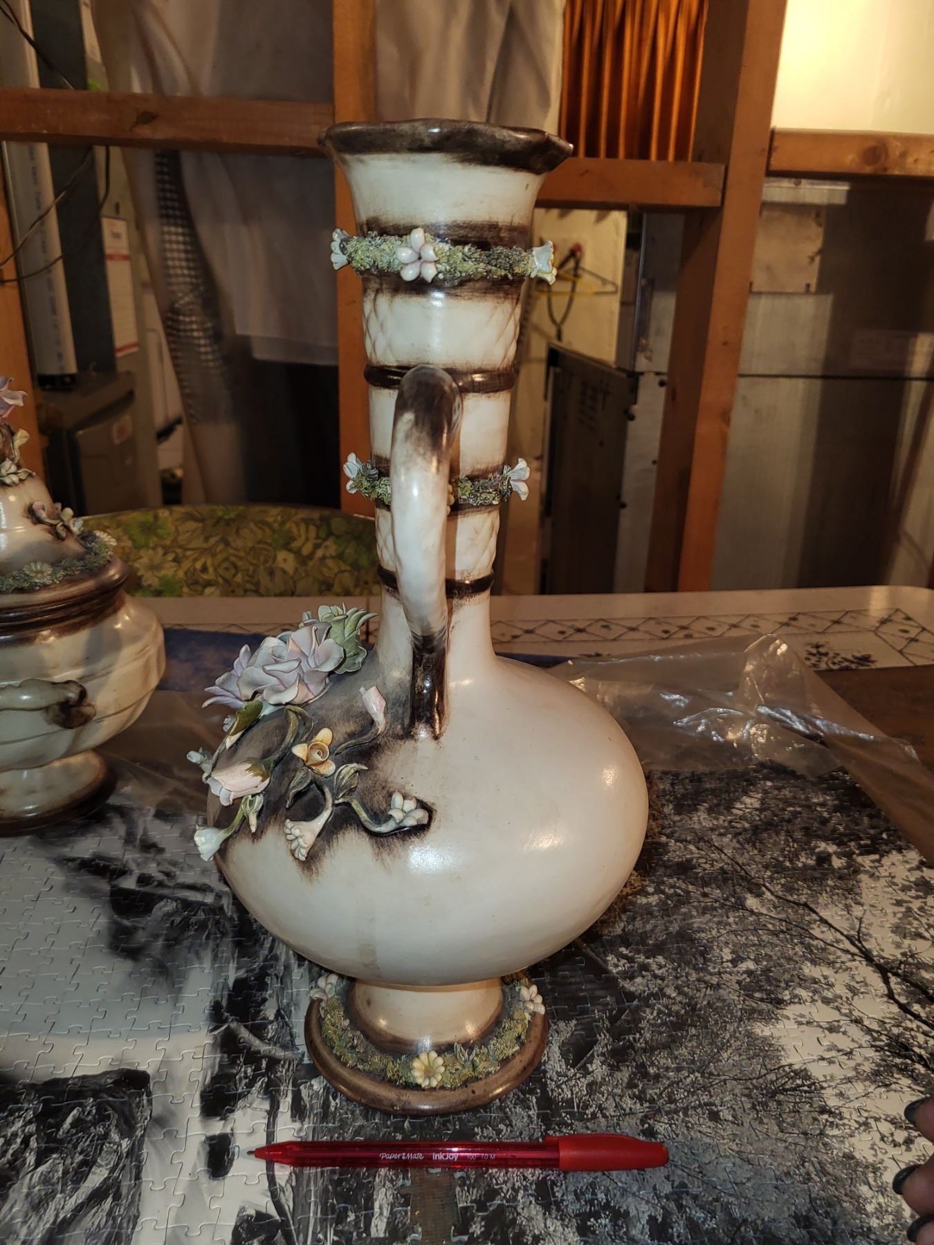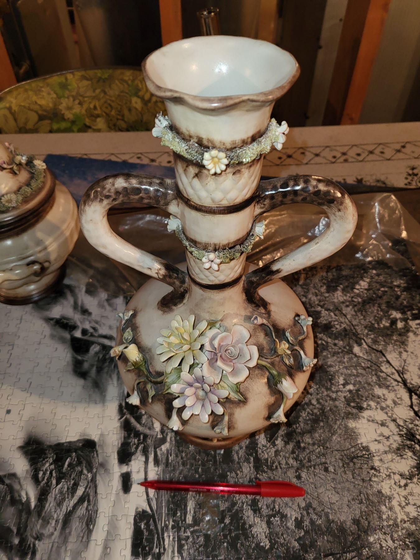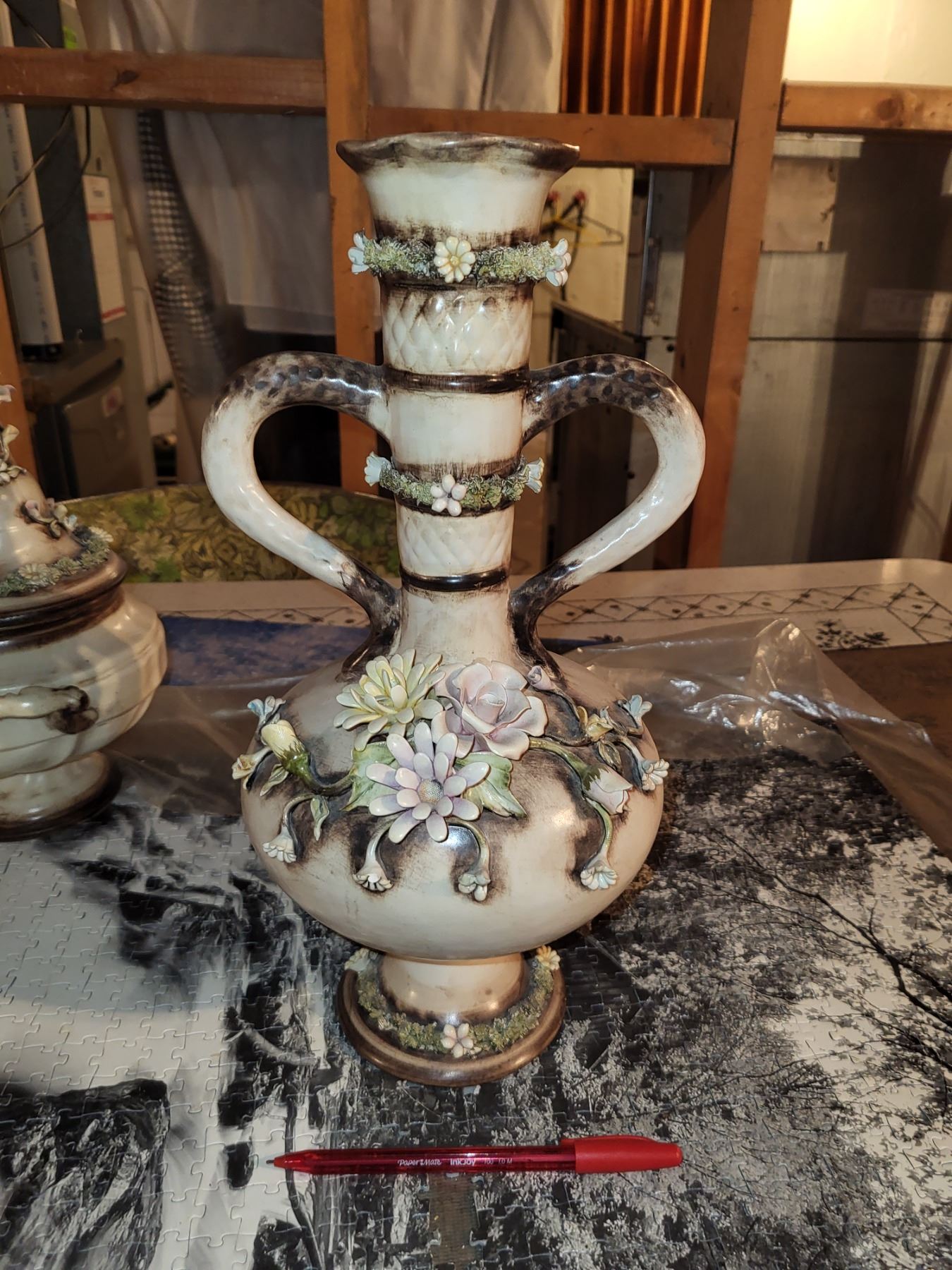 LARGE CAPODIMONTE FLORAL DESIGN VASE. MEASURES 7.5" X 14.25" TALL. NO KNOWN CHIPS
