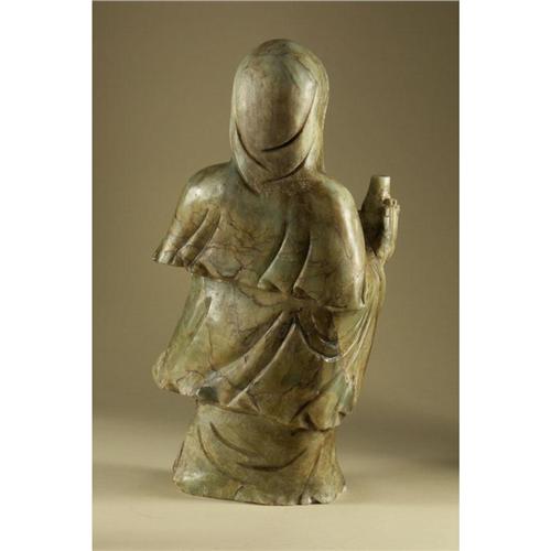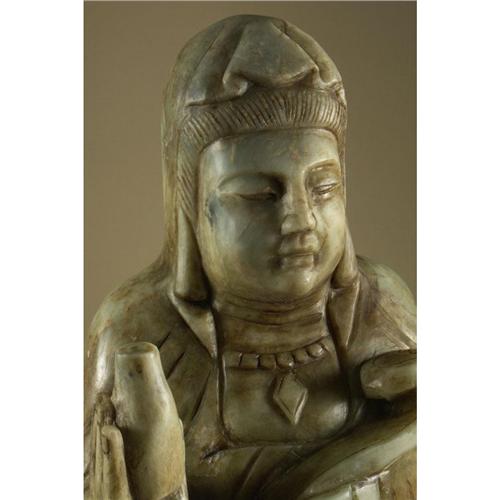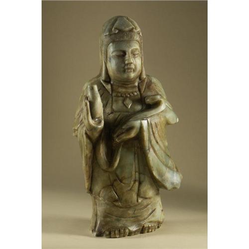 STONE SCULPTURE: Large Chinese carved green hard stone sculpture, Quan Yin holding water vase and scroll, 22'' x 11'', 20th century.