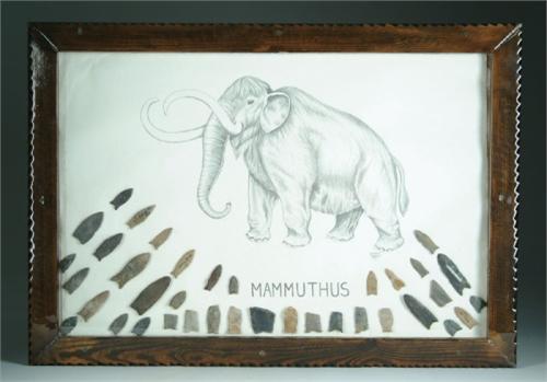 LARGE CASE WITH MAMMUTHUS DRAWING WITH 37 PALEO INDIAN TYPE POINTS. Paleo Indian, Circa 10000BC style-8000BC style. Fluted and unfluted points. Several marked ""Green County Tennessee"", ""Knox County Kentucky"", ""Kentucky River"", ""Green River Kentucky"", and more. CONDITION: Range from broken to very good. 9-25984-99 The Tennessee Collection of Prehistoric Indian Artifacts from the Allen Graves Estate. SPECIAL NOTE: We do not regularly sell Prehistoric Indian stone artifacts and therefore have very little experience and no expertise in this area. All of the following lots have come from the Collection of the Late Allen Graves of Tennessee. The collection was inherited some years back by his daughter, who now lives in Maine. This collection was consigned to us directly from her. We employed someone to generally identify styles and types, but as stated above, due to our lack of expertise in this field, we can not guarantee the age or origin of the following pieces. We are relying on you, the buyer, to determine to your satisfaction the origin and age of each item in the collection.