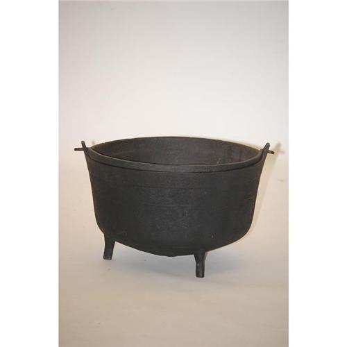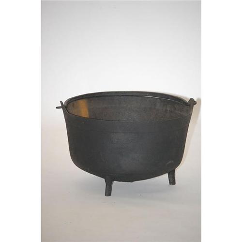 LARGE CAST IRON FOOTED CAULDRON - LARGE 19TH CENT. BLACK 3-FOOTED IRON KETTLE/CAULDRON W/ WROUGHT IRON BAIL HANDLE & WROUGHT IRON BASE W/ SPRUE (14" T X 21 1/2" ROUND) - NORMAL WEAR