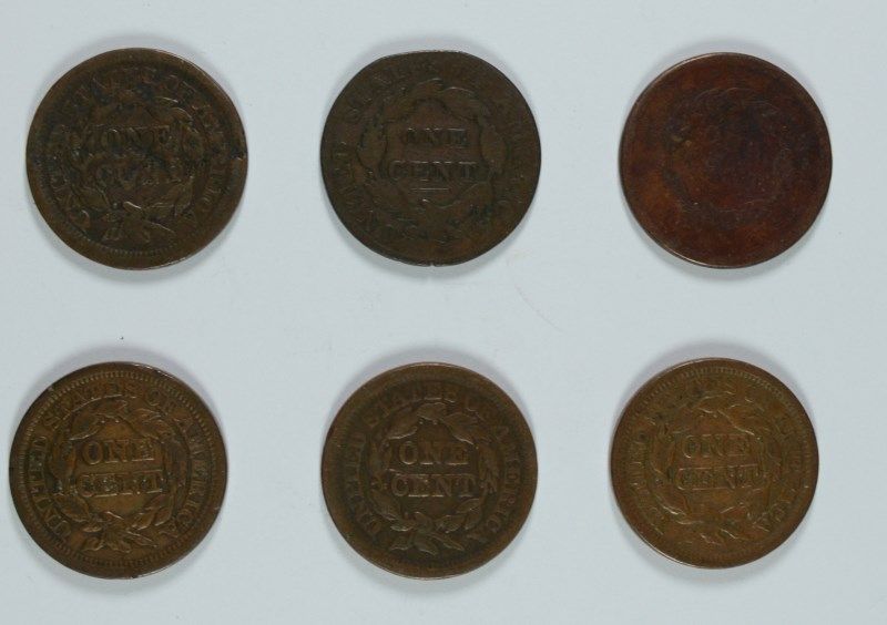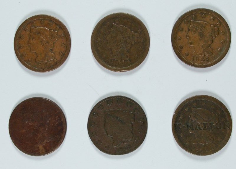 LARGE CENTS 1828-G, 1850 COUNTER STAMPED H MALLON, 1840-AG, 1848-VF, 1854-VG AND