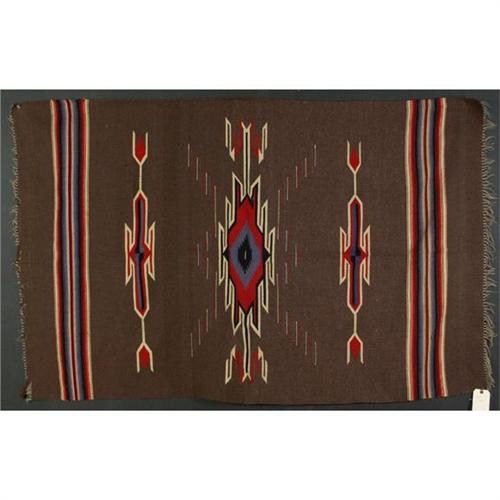 WEAVING: Chimayo weaving of machine-spun aniline-dyed wool having brown ground, predominately blue and red banding with three central geometric motifs. Some fringe missing, unraveling. Mid-20th c. 72'' x 44.5''
