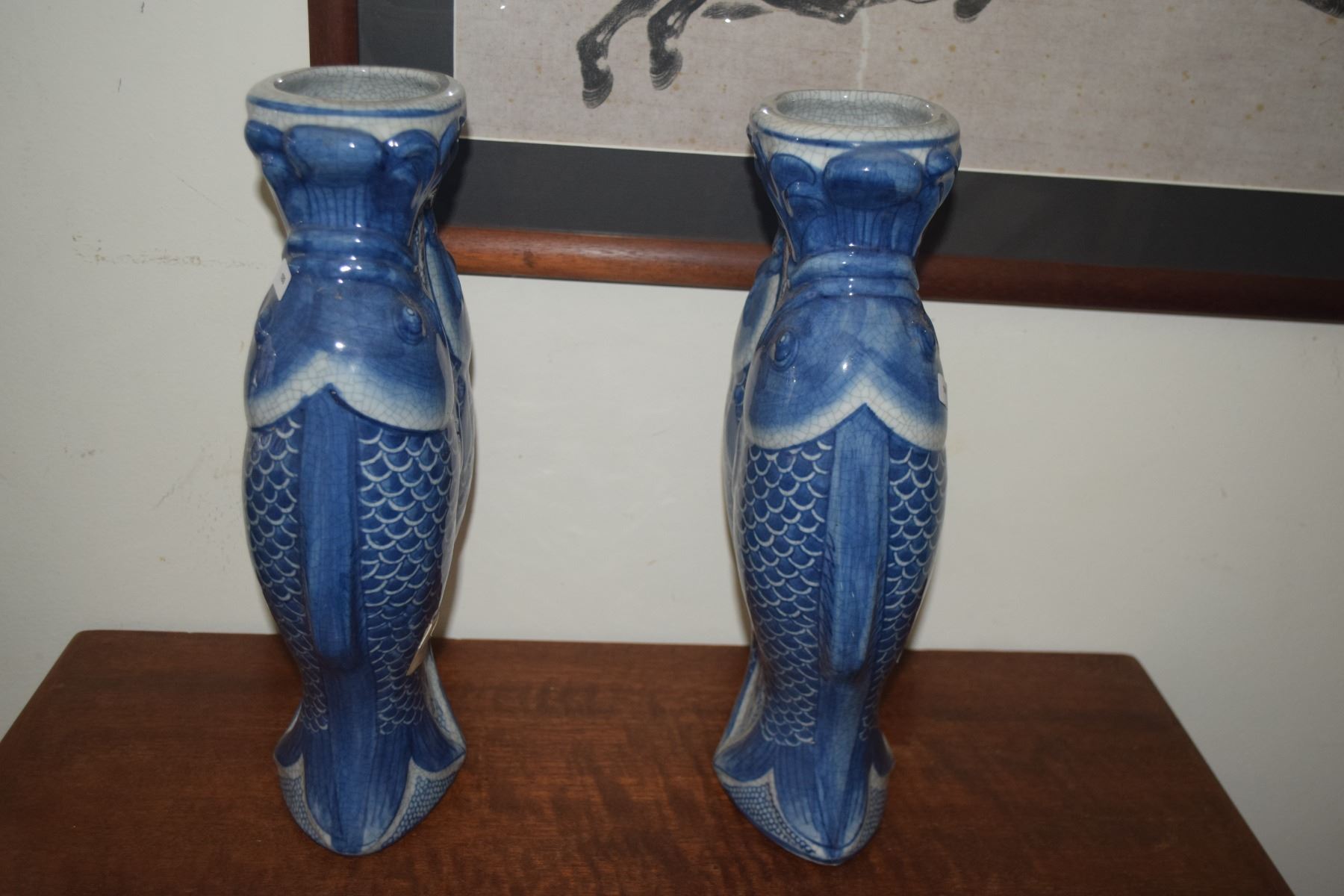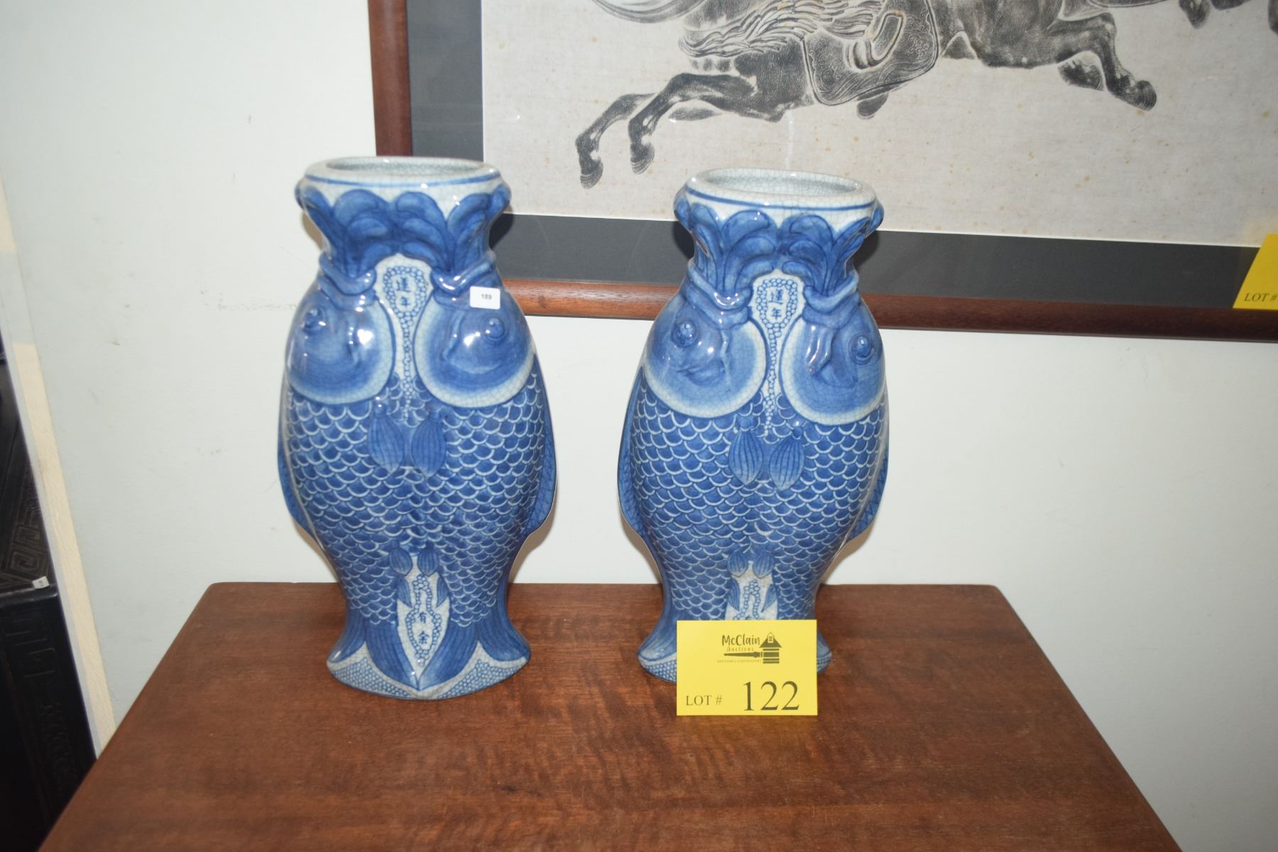 LARGE CHINESE BLUE & WHITE DOUBLE FISH FORM VASES (PAIR)