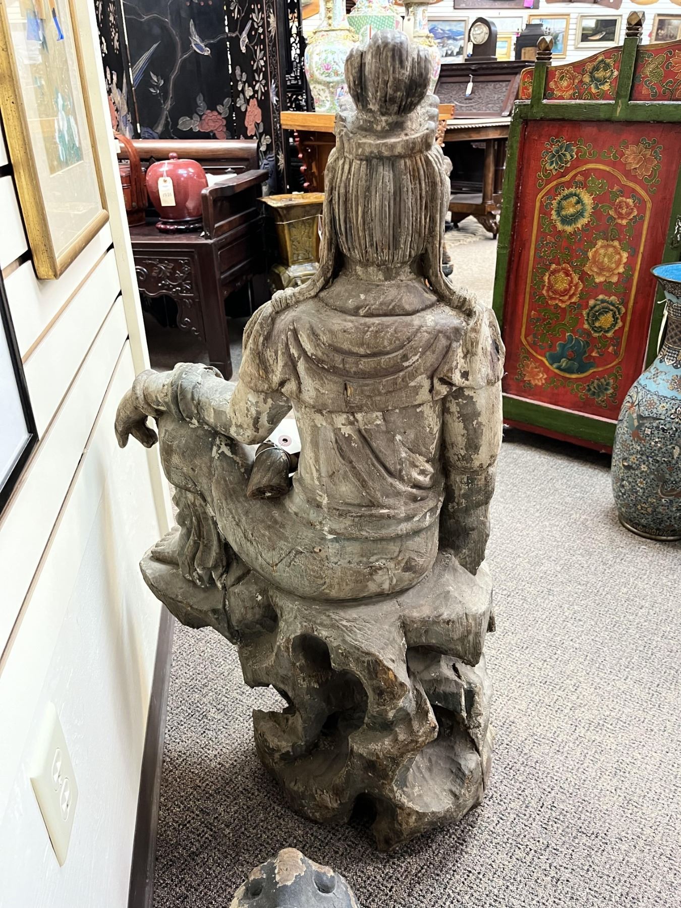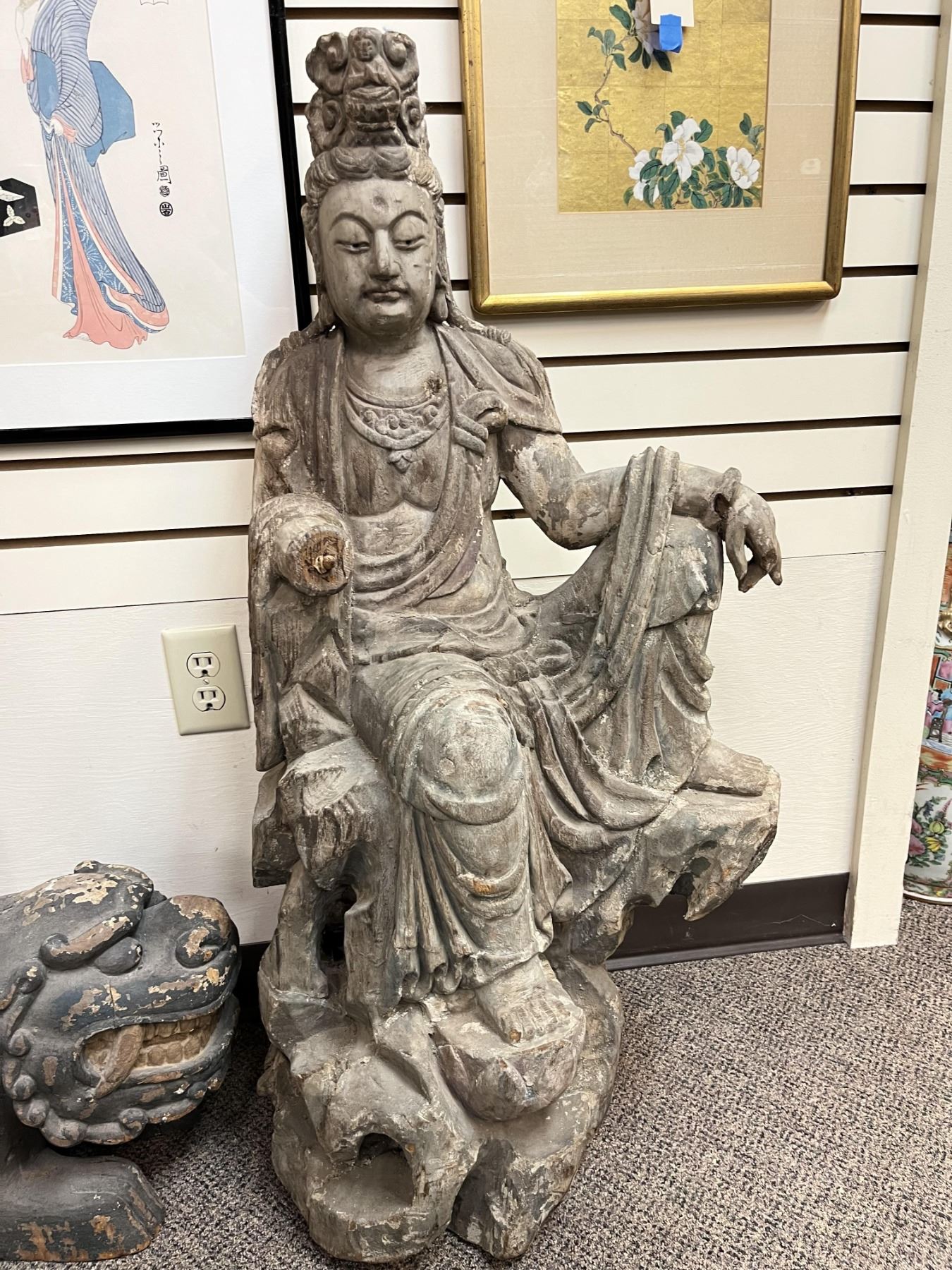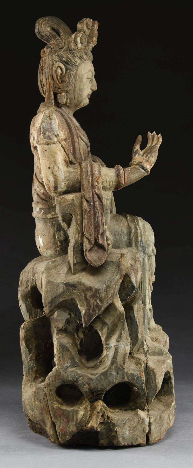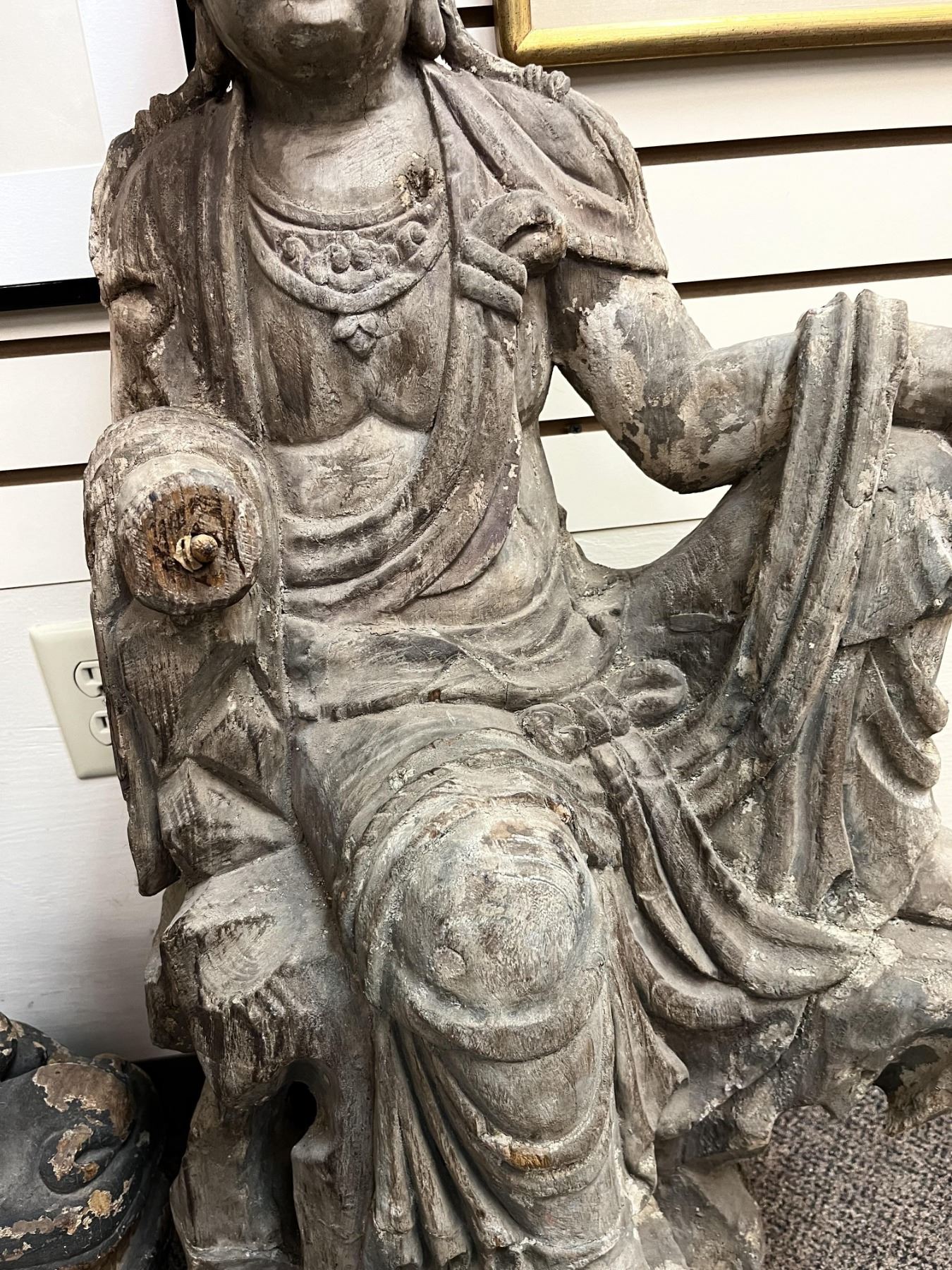 GUANYIN. 19th-20th century. The seated deity shown atop a rockery with hands in a mudra and wearing detailed headpiece. SIZE: 39" h. CONDITION: right hand detached with losses to finger tips. Loss to the edge of foot. Crack at front section of base. Scattered wear and small chips to surface throughout. (05-345/JC). $400-800.