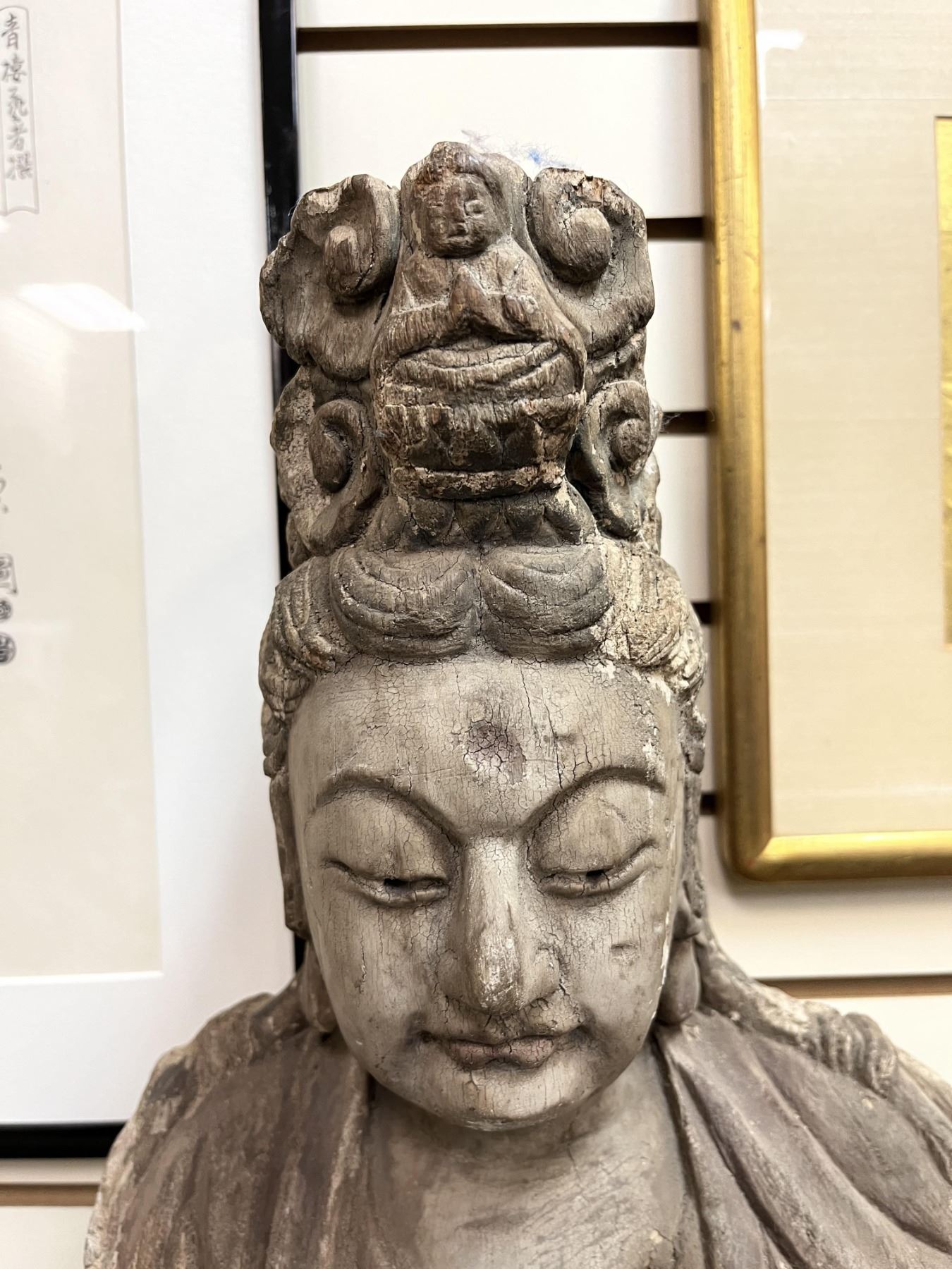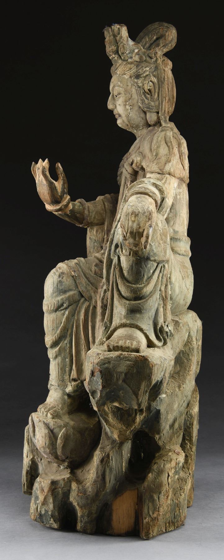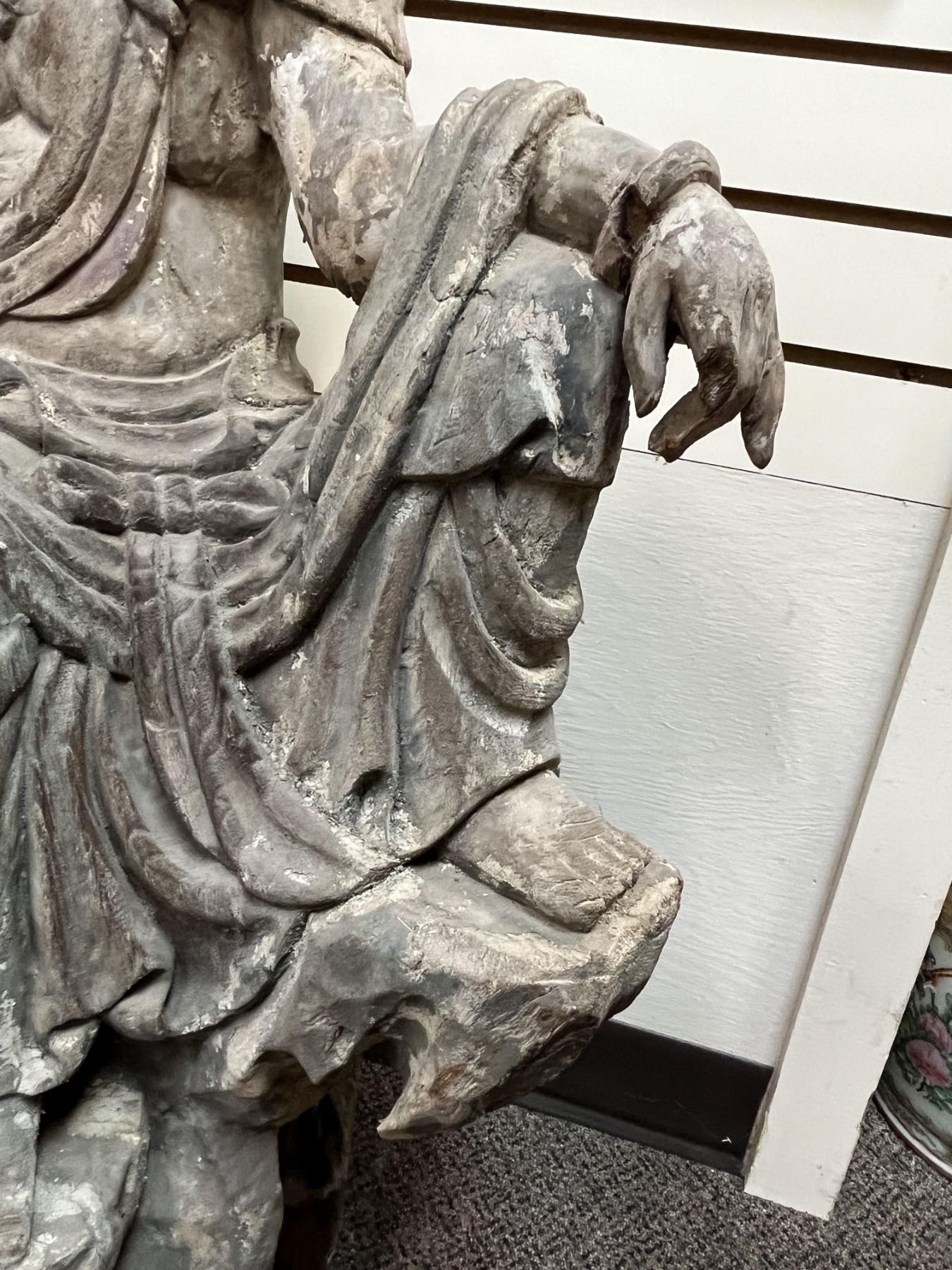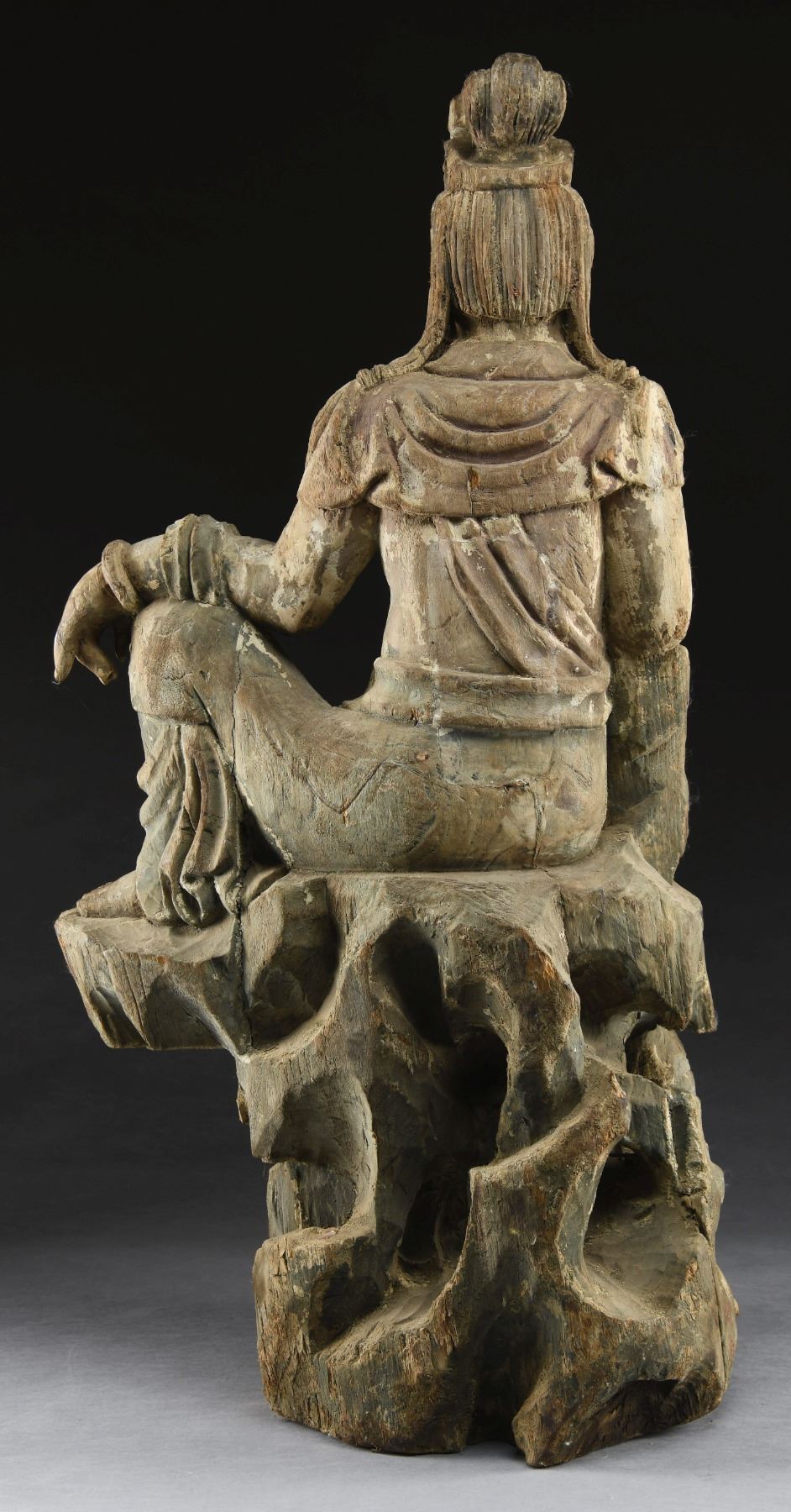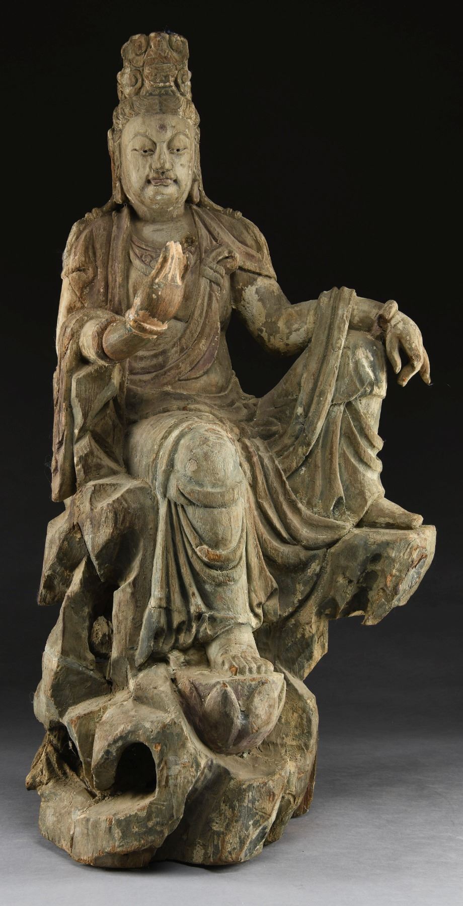 GUANYIN. 19th-20th century. The seated deity shown atop a rockery with hands in a mudra and wearing detailed headpiece. SIZE: 39" h. CONDITION: right hand detached with losses to finger tips. Loss to the edge of foot. Crack at front section of base. Scattered wear and small chips to surface throughout. (05-345/JC). $400-800.