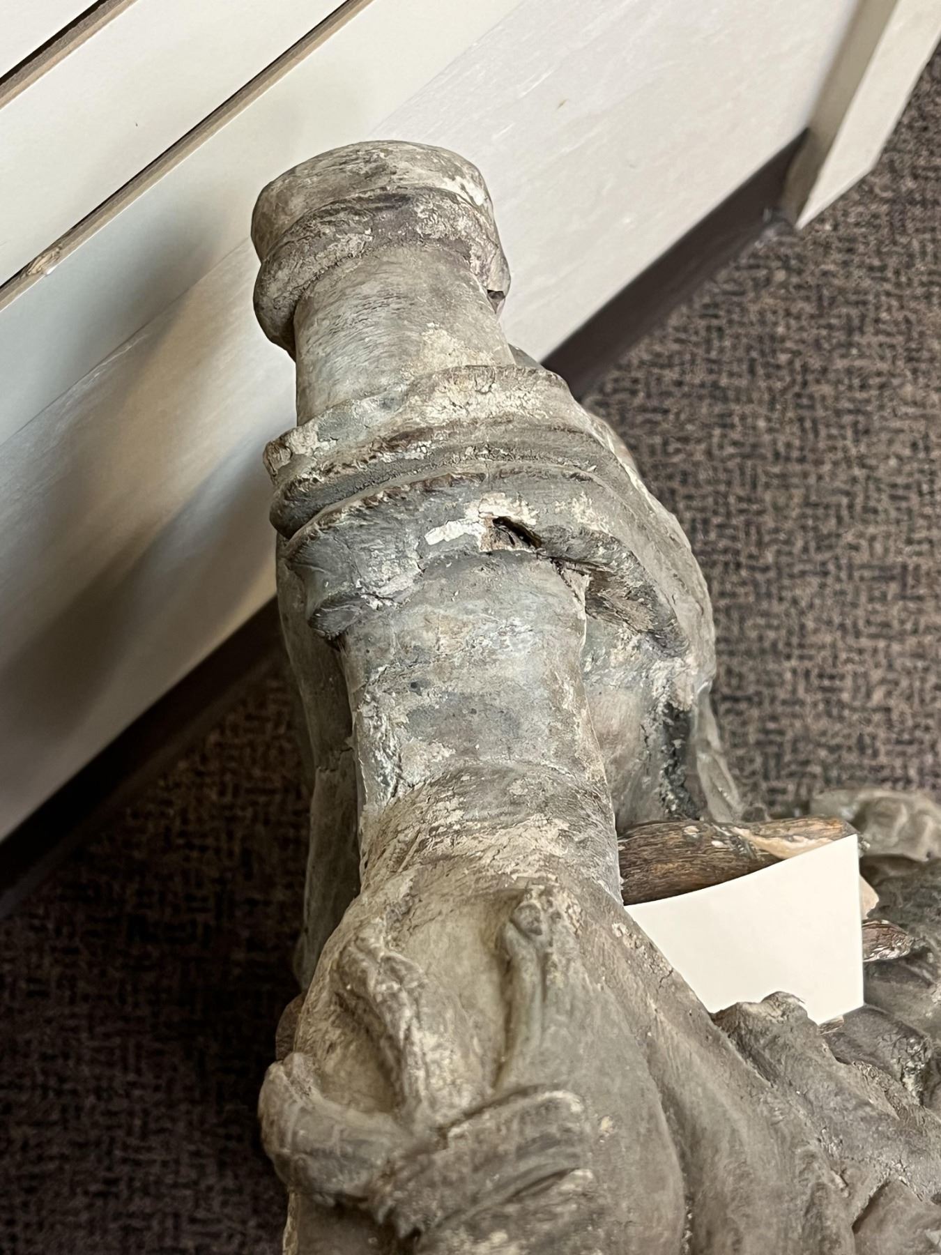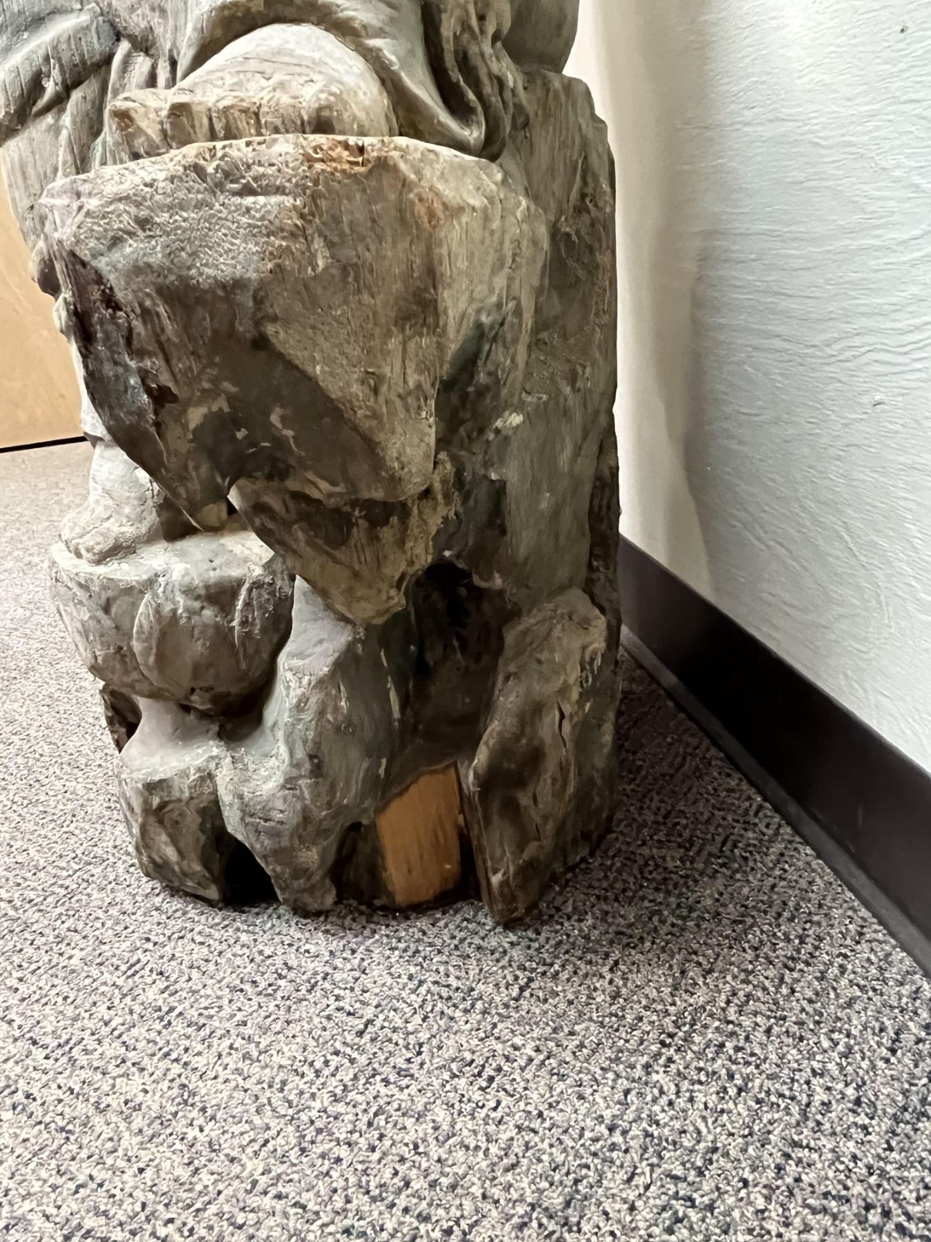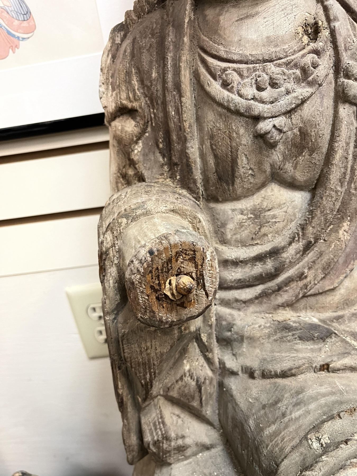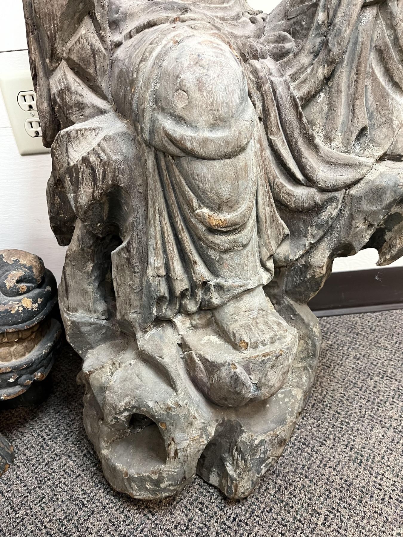 GUANYIN. 19th-20th century. The seated deity shown atop a rockery with hands in a mudra and wearing detailed headpiece. SIZE: 39" h. CONDITION: right hand detached with losses to finger tips. Loss to the edge of foot. Crack at front section of base. Scattered wear and small chips to surface throughout. (05-345/JC). $400-800.