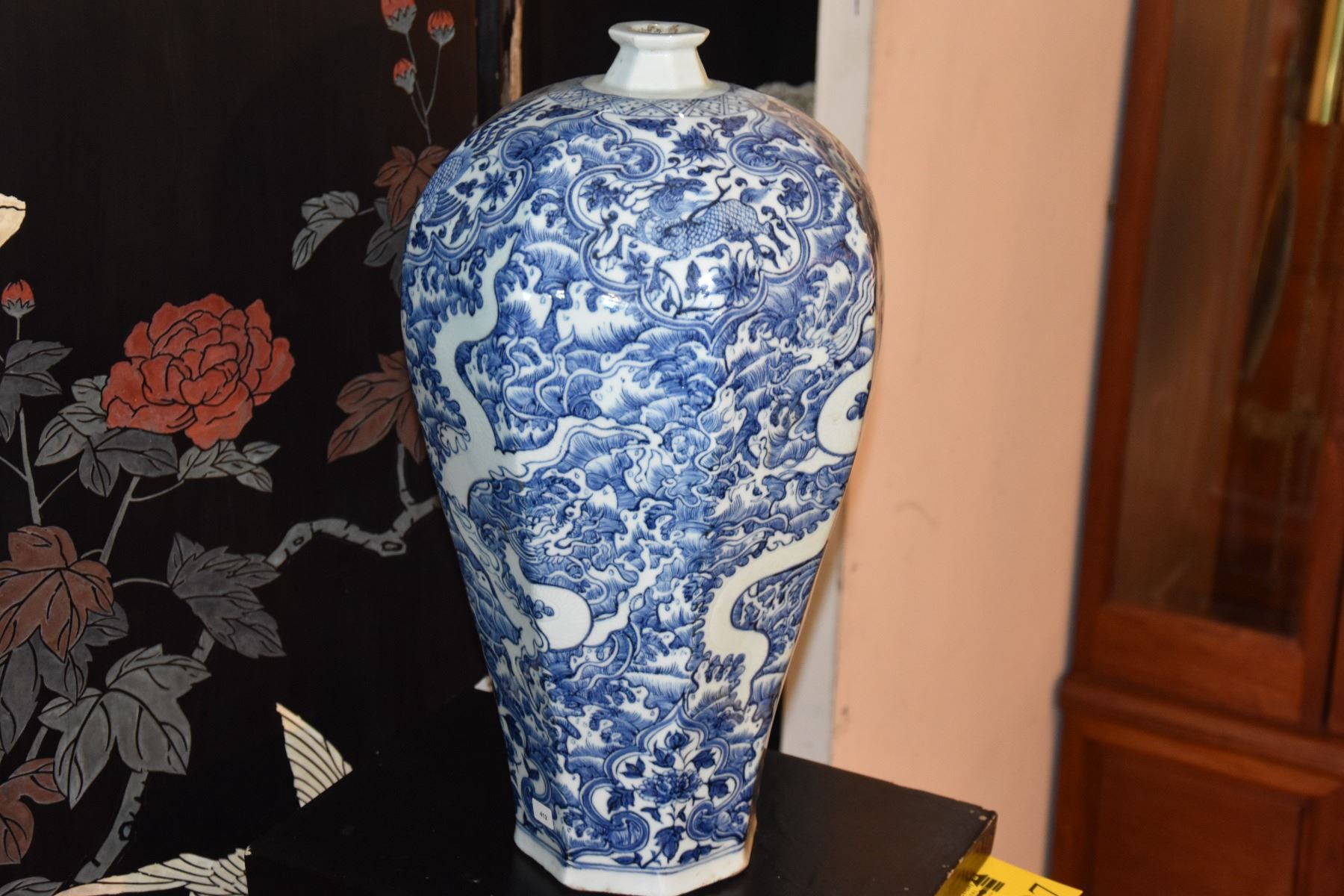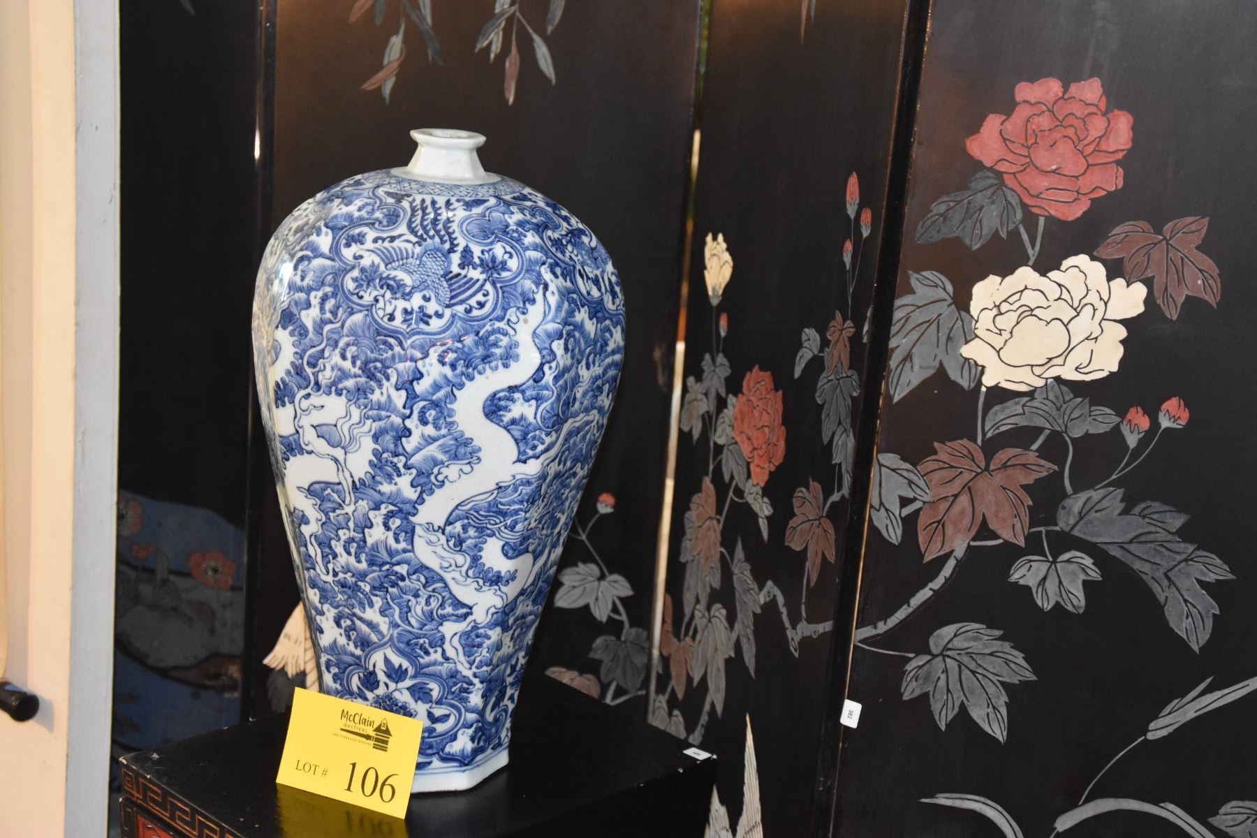 LARGE CHINESE PORCELAIN BLUE & WHITE MEIPING SHAPE VASE, DRAGON, PHOENIX & CHILIN MOTIF (18 )