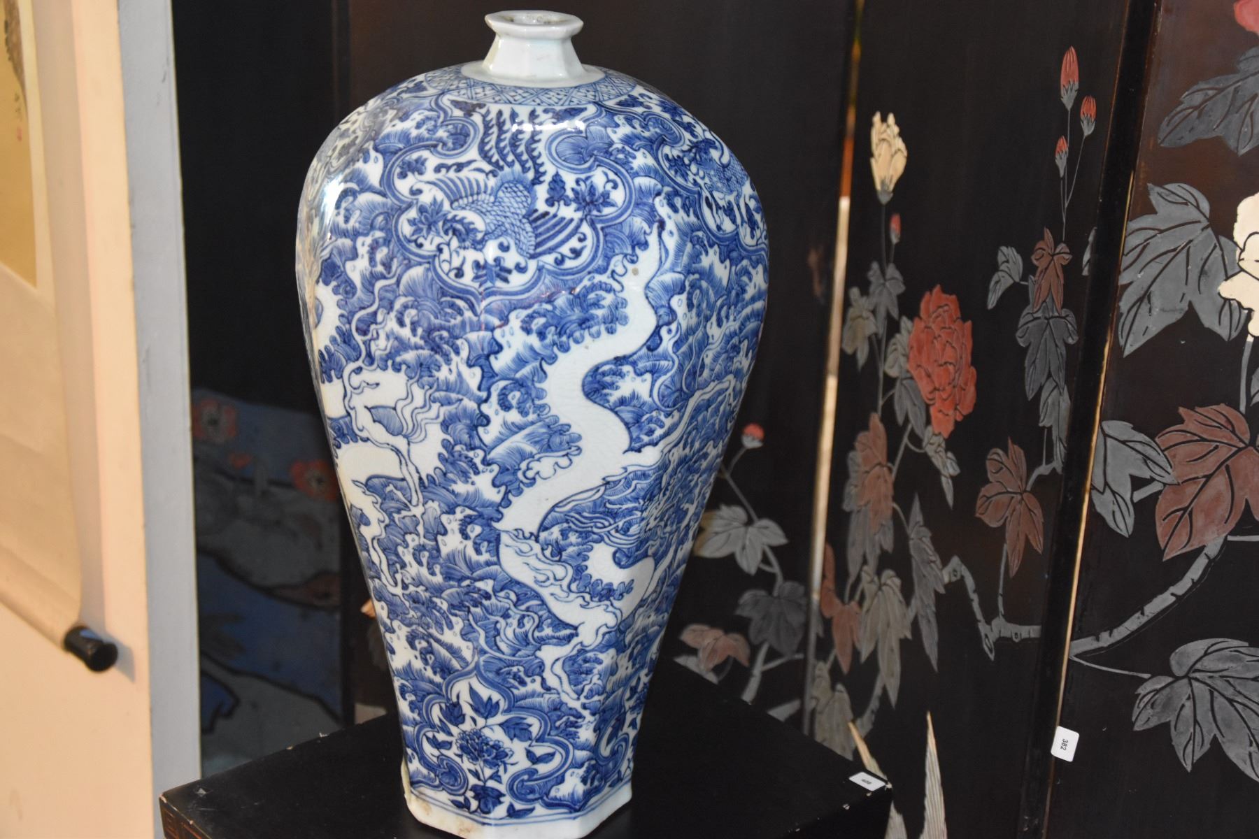 LARGE CHINESE PORCELAIN BLUE & WHITE MEIPING SHAPE VASE, DRAGON, PHOENIX & CHILIN MOTIF (18")