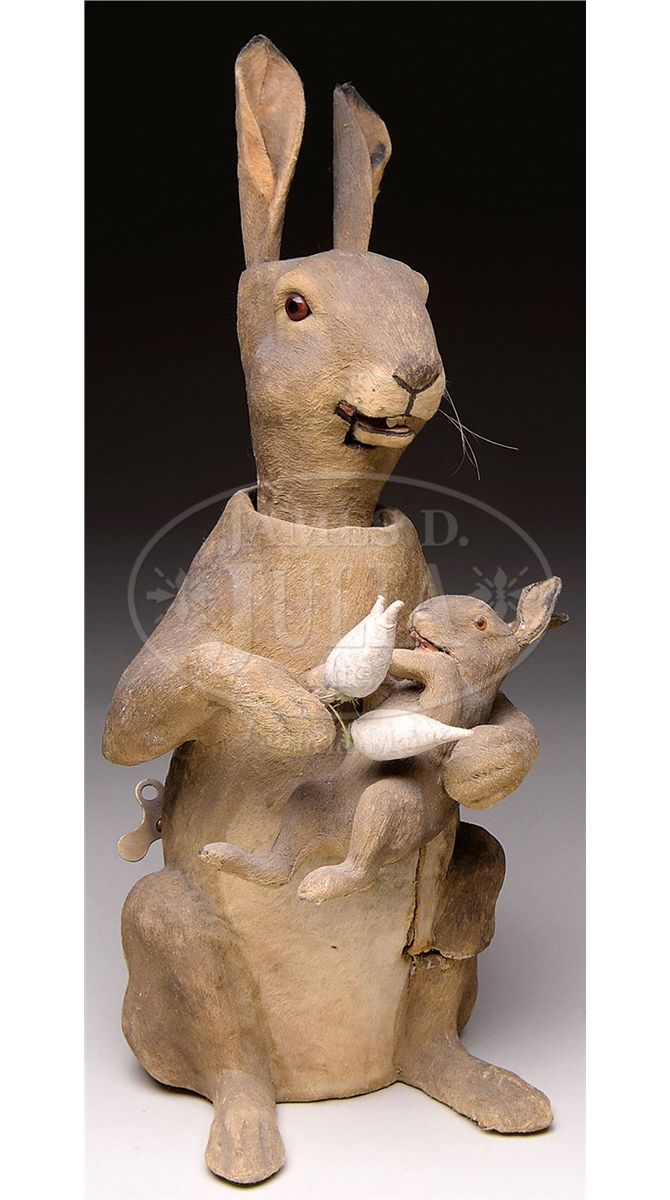 Used as store display or Easter decoration. Cloth covered papier mache construction. Larger rabbit and baby have glass eyes and cloth ears. Windup mechanism would cause nodding action with opening mouth. SIZE: 16-1/2" t. CONDITION: Heavy soiling to fur on rabbits bodies and in need of a good cleaning. Clockwork mechanism is working and head nods, however mechanism is not attached to head and is loose in rabbits body. Figure has overall soiling and appears complete. Mechanism is loose in body. Side access panel detached but present. 1-13450