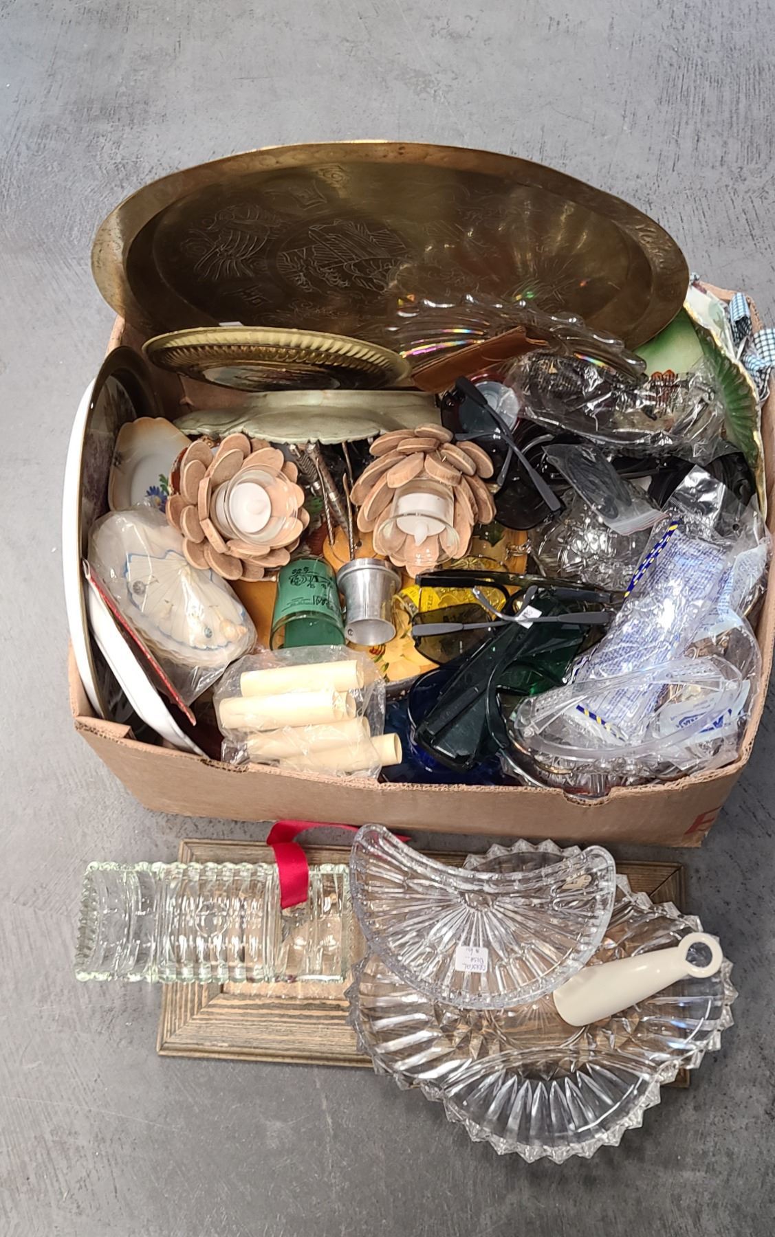 LARGE COLLECTION ASSORTED VINTAGE BRASS PLAQUES, DISHES, SUNGLASSES ETC, NO SHIPPING