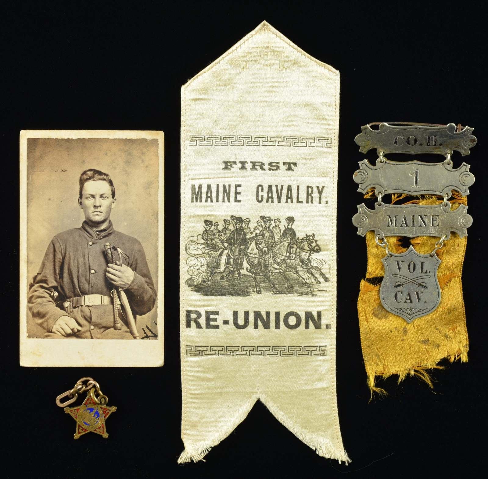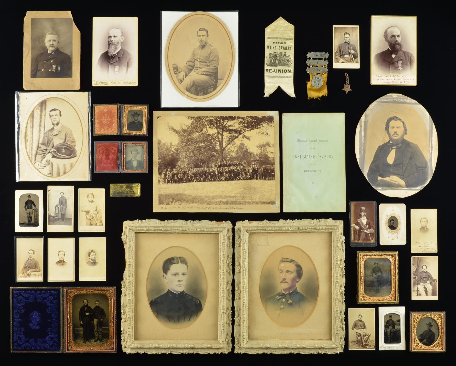 MEMORABILIA. This wonderful grouping was collected by lifelong 1st Maine cavalry collector Glen Gagne who methodically bought every fine identified image he could of this hard fought regiment. Most of the images were found in Maine near where unit was recruited, many came from other early Maine collectors like Tom MacDonald & Bedford Hayes; many have tags or notes from MacDonald & Hayes. You will not find a better group of 1st ME Cavalry images: