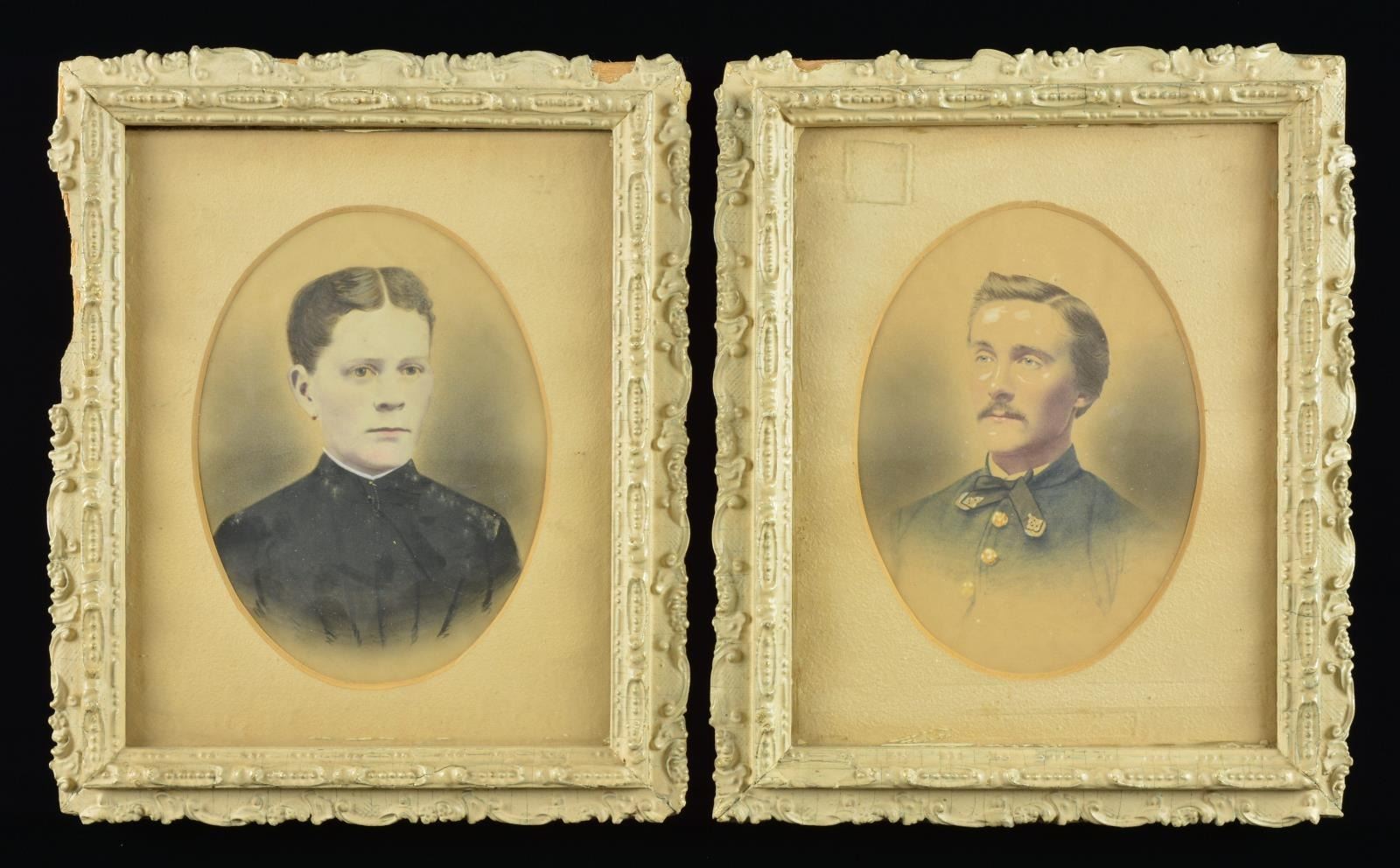 19. Pair of framed colored portraits of Alonzo Pratt & his widow. Alonzo died Andersonville and is buried at National Cemetery there in grave No. 5698.
